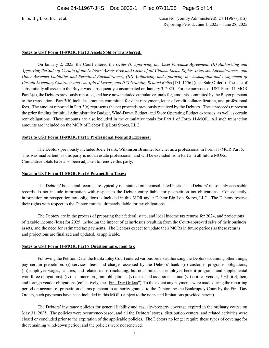 In re: Big Lots, Inc., et al. Case No. (Jointly Administered): 24-11967 (JKS) Reporting Period: June 1, 2025 – June 28, 2025 5 Notes to UST Form 11-MOR, Part 3 Assets Sold or Transferred: On January 2, 2025, the Court entered the Order (I) Approving the Asset Purchase Agreement, (II) Authorizing and Approving the Sale of Certain of the Debtors’ Assets Free and Clear of all Claims, Liens, Rights, Interests, Encumbrances, and Other Assumed Liabilities and Permitted Encumbrances, (III) Authorizing and Approving the Assumption and Assignment of Certain Executory Contracts and Unexpired Leases, and (IV) Granting Related Relief [D.I. 1556] (the “Sale Order”). The sale of substantially all assets to the Buyer was subsequently consummated on January 3, 2025. For the purposes of UST Form 11-MOR Part 3(a), the Debtors previously reported, and have now included cumulative totals for, amounts committed by the Buyer pursuant to the transaction. Part 3(b) includes amounts committed for debt repayment, letter of credit collateralization, and professional fees. The amount reported in Part 3(c) represents the net proceeds previously received by the Debtors. These proceeds represent the prior funding for initial Administrative Budget, Wind-Down Budget, and Store Operating Budget expenses, as well as certain rent obligations. These amounts are also included in the cumulative totals for Part 1 of Form 11-MOR. All such transaction amounts are included on the MOR of Debtor Big Lots Stores, LLC. Notes to UST Form 11-MOR, Part 5 Professional Fees and Expenses: The Debtors previously included Joele Frank, Wilkinson Brimmer Katcher as a professional in Form 11-MOR Part 5. This was inadvertent, as this party is not an estate professional, and will be excluded from Part 5 in all future MORs. Cumulative totals have also been adjusted to remove this party. Notes to UST Form 11-MOR, Part 6 Postpetition Taxes: The Debtors’ books and records are typically maintained on a consolidated basis. The Debtors’ reasonably accessible records do not include information with respect to the Debtor entity liable for postpetition tax obligations. Consequently, information on postpetition tax obligations is included in this MOR under Debtor Big Lots Stores, LLC. The Debtors reserve their rights with respect to the Debtor entities ultimately liable for tax obligations. The Debtors are in the process of preparing their federal, state, and local income tax returns for 2024, and projections of taxable income (loss) for 2025, including the impact of gains/losses resulting from the Court-approved sales of their business assets, and the need for estimated tax payments. The Debtors expect to update their MORs in future periods as these returns and projections are finalized and updated, as applicable. Notes to UST Form 11-MOR, Part 7 Questionnaire, item (a): Following the Petition Date, the Bankruptcy Court entered various orders authorizing the Debtors to, among other things, pay certain prepetition: (i) services, fees, and charges assessed by the Debtors’ bank; (ii) customer programs obligations; (iii) employee wages, salaries, and related items (including, but not limited to, employee benefit programs and supplemental workforce obligations); (iv) insurance program obligations; (v) taxes and assessments; and (vi) critical vendor, 503(b)(9), lien, and foreign vendor obligations (collectively, the “First Day Orders”). To the extent any payments were made during the reporting period on account of prepetition claims pursuant to authority granted to the Debtors by the Bankruptcy Court by the First Day Orders, such payments have been included in this MOR (subject to the notes and limitations provided herein). The Debtors’ insurance policies for general liability and casualty/property coverage expired in the ordinary course on May 31, 2025. The policies were occurrence-based, and all the Debtors’ stores, distribution centers, and related activities were closed or concluded prior to the expiration of the applicable policies. The Debtors no longer require these types of coverage for the remaining wind-down period, and the policies were not renewed. Case 24-11967-JKS Doc 3032-1 Filed 07/31/25 Page 5 of 14