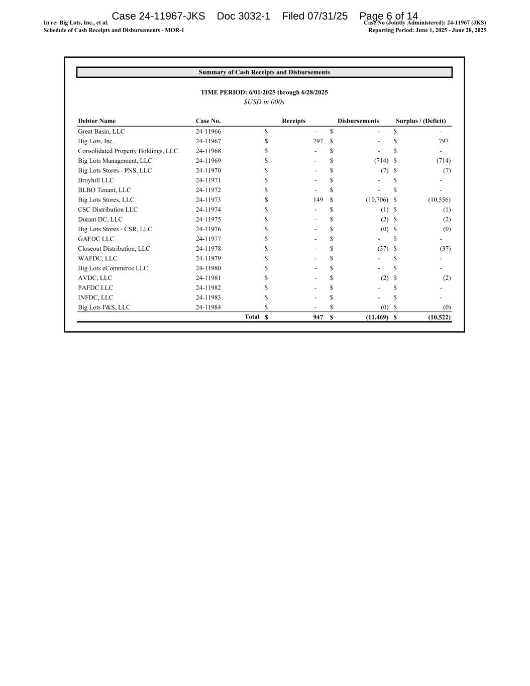 In re: Big Lots, Inc., et al. Schedule of Cash Receipts and Disbursements - MOR-1 Case No (Jointly Administered): 24-11967 (JKS) Reporting Period: June 1, 2025 - June 28, 2025 Summary of Cash Receipts and Disbursements TIME PERIOD: 6/01/2025 through 6/28/2025 Debtor Name Case No. Receipts Disbursements Surplus / (Deficit) Great Basin, LLC 24-11966 -$ -$ -$ Big Lots, Inc. 24-11967 797$ -$ 797$ Consolidated Property Holdings, LLC 24-11968 -$ -$ -$ Big Lots Management, LLC 24-11969 -$ (714)$ (714)$ Big Lots Stores - PNS, LLC 24-11970 -$ (7)$ (7)$ Broyhill LLC 24-11971 -$ -$ -$ BLBO Tenant, LLC 24-11972 -$ -$ -$ Big Lots Stores, LLC 24-11973 149$ (10,706)$ (10,556)$ CSC Distribution LLC 24-11974 -$ (1)$ (1)$ Durant DC, LLC 24-11975 -$ (2)$ (2)$ Big Lots Stores - CSR, LLC 24-11976 -$ (0)$ (0)$ GAFDC LLC 24-11977 -$ -$ -$ Closeout Distribution, LLC 24-11978 -$ (37)$ (37)$ WAFDC, LLC 24-11979 -$ -$ -$ Big Lots eCommerce LLC 24-11980 -$ -$ -$ AVDC, LLC 24-11981 -$ (2)$ (2)$ PAFDC LLC 24-11982 -$ -$ -$ INFDC, LLC 24-11983 -$ -$ -$ Big Lots F&S, LLC 24-11984 -$ (0)$ (0)$ Total 947$ (11,469)$ (10,522)$ $USD in 000s Case 24-11967-JKS Doc 3032-1 Filed 07/31/25 Page 6 of 14