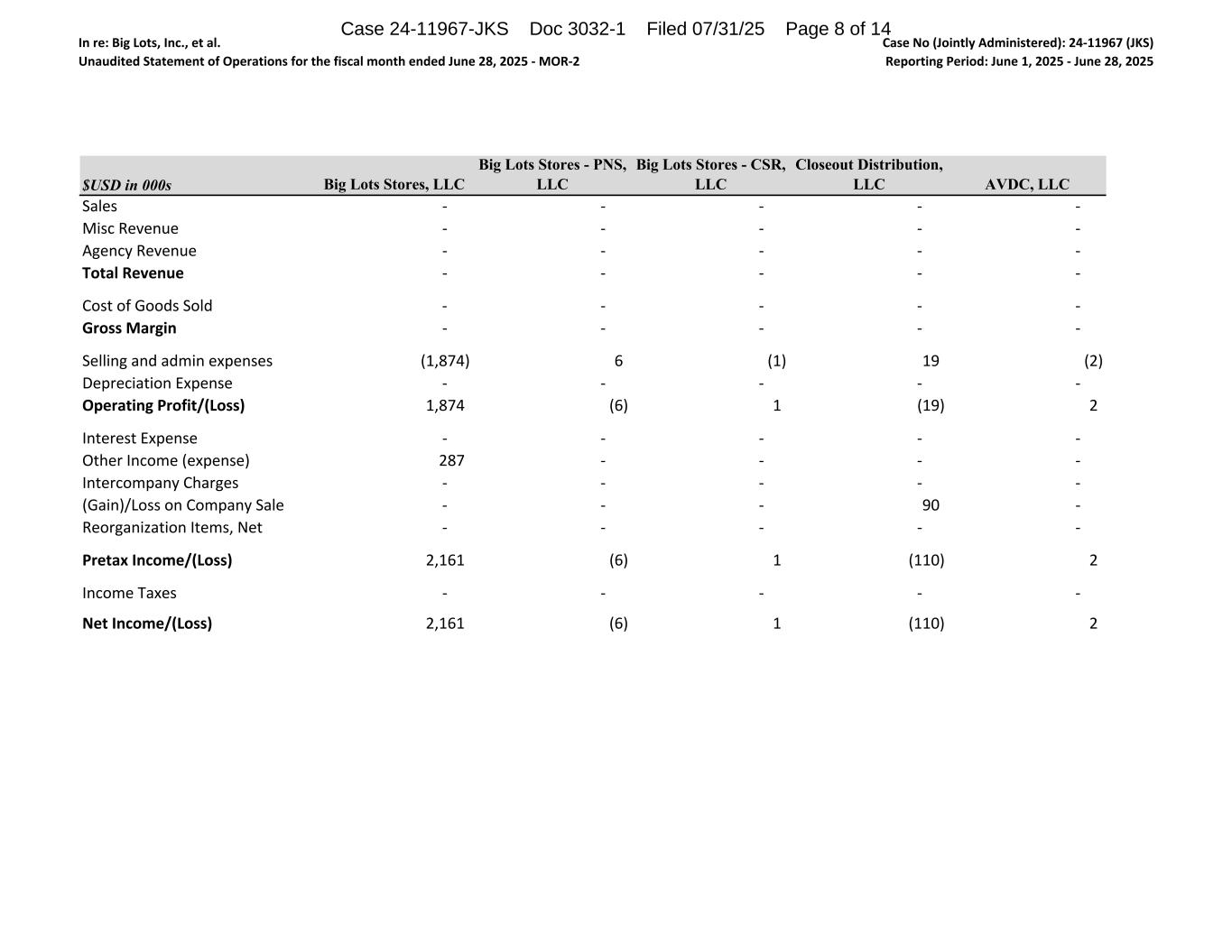 In re: Big Lots, Inc., et al. Unaudited Statement of Operations for the fiscal month ended June 28, 2025 - MOR-2 Case No (Jointly Administered): 24-11967 (JKS) Reporting Period: June 1, 2025 - June 28, 2025 $USD in 000s Big Lots Stores, LLC Big Lots Stores - PNS, LLC Big Lots Stores - CSR, LLC Closeout Distribution, LLC AVDC, LLC Sales - - - - - Misc Revenue - - - - - Agency Revenue - - - - - Total Revenue - - - - - Cost of Goods Sold - - - - - Gross Margin - - - - - Selling and admin expenses (1,874) 6 (1) 19 (2) Depreciation Expense - - - - - Operating Profit/(Loss) 1,874 (6) 1 (19) 2 Interest Expense - - - - - Other Income (expense) 287 - - - - Intercompany Charges - - - - - (Gain)/Loss on Company Sale - - - 90 - Reorganization Items, Net - - - - - Pretax Income/(Loss) 2,161 (6) 1 (110) 2 Income Taxes - - - - - Net Income/(Loss) 2,161 (6) 1 (110) 2 Case 24-11967-JKS Doc 3032-1 Filed 07/31/25 Page 8 of 14