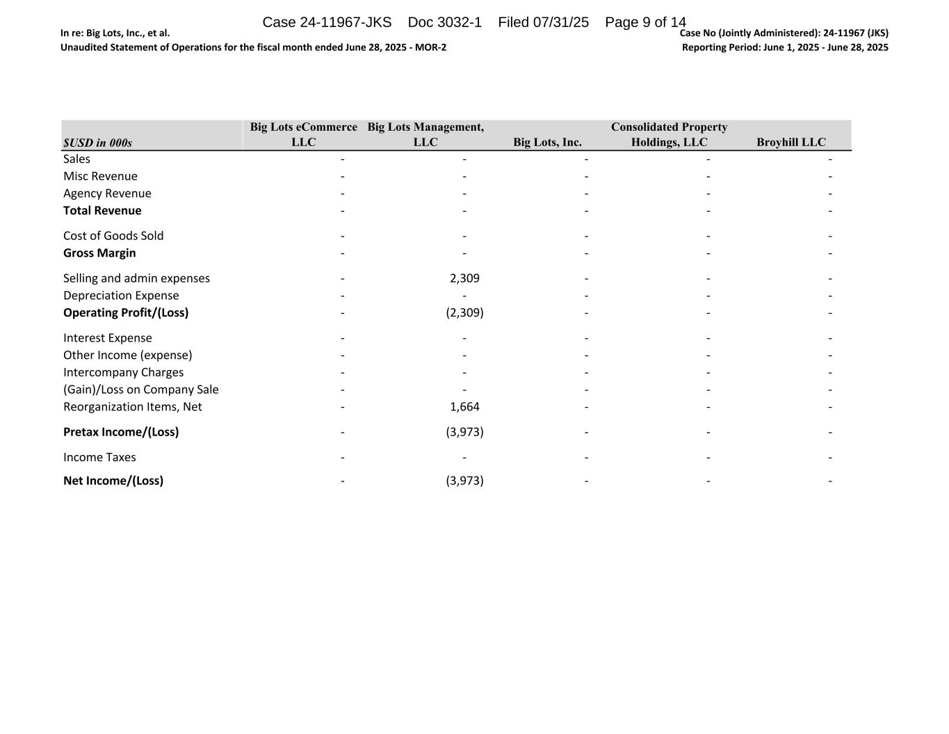 In re: Big Lots, Inc., et al. Unaudited Statement of Operations for the fiscal month ended June 28, 2025 - MOR-2 Case No (Jointly Administered): 24-11967 (JKS) Reporting Period: June 1, 2025 - June 28, 2025 $USD in 000s Sales Misc Revenue Agency Revenue Total Revenue Cost of Goods Sold Gross Margin Selling and admin expenses Depreciation Expense Operating Profit/(Loss) Interest Expense Other Income (expense) Intercompany Charges (Gain)/Loss on Company Sale Reorganization Items, Net Pretax Income/(Loss) Income Taxes Net Income/(Loss) Big Lots eCommerce LLC Big Lots Management, LLC Big Lots, Inc. Consolidated Property Holdings, LLC Broyhill LLC - - - - - - - - - - - - - - - - - - - - - - - - - - - - - - - 2,309 - - - - - - - - - (2,309) - - - - - - - - - - - - - - - - - - - - - - - - 1,664 - - - - (3,973) - - - - - - - - - (3,973) - - - Case 24-11967-JKS Doc 3032-1 Filed 07/31/25 Page 9 of 14
