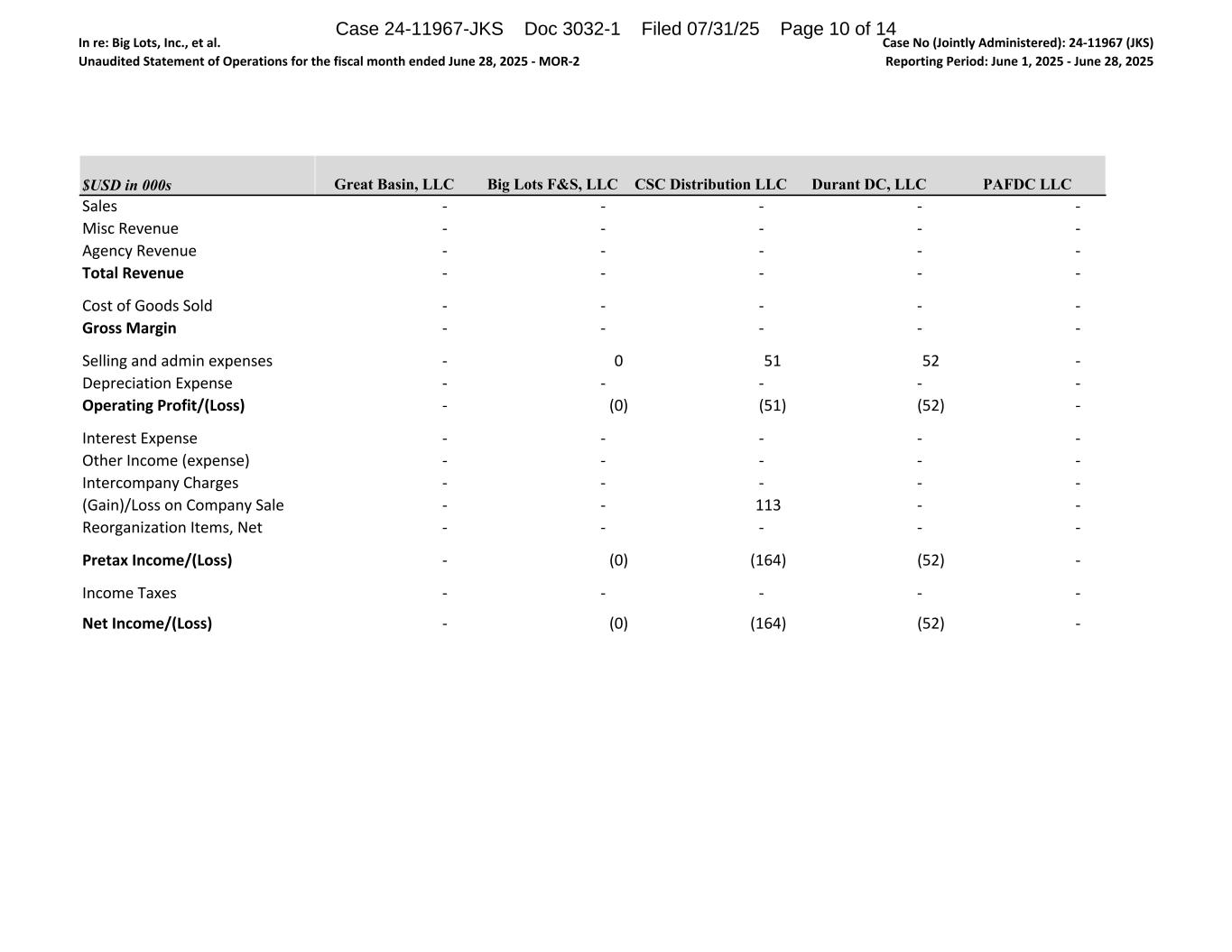 In re: Big Lots, Inc., et al. Unaudited Statement of Operations for the fiscal month ended June 28, 2025 - MOR-2 Case No (Jointly Administered): 24-11967 (JKS) Reporting Period: June 1, 2025 - June 28, 2025 $USD in 000s Sales Misc Revenue Agency Revenue Total Revenue Cost of Goods Sold Gross Margin Selling and admin expenses Depreciation Expense Operating Profit/(Loss) Interest Expense Other Income (expense) Intercompany Charges (Gain)/Loss on Company Sale Reorganization Items, Net Pretax Income/(Loss) Income Taxes Net Income/(Loss) Great Basin, LLC Big Lots F&S, LLC CSC Distribution LLC Durant DC, LLC PAFDC LLC - - - - - - - - - - - - - - - - - - - - - - - - - - - - - - - 0 51 52 - - - - - - - (0) (51) (52) - - - - - - - - - - - - - - - - - - 113 - - - - - - - - (0) (164) (52) - - - - - - - (0) (164) (52) - Case 24-11967-JKS Doc 3032-1 Filed 07/31/25 Page 10 of 14