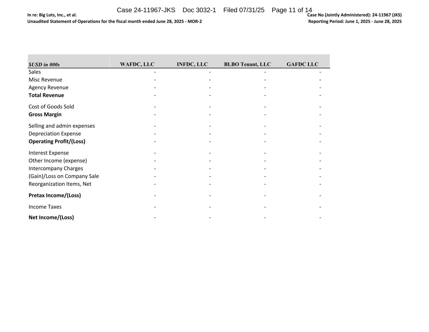 In re: Big Lots, Inc., et al. Unaudited Statement of Operations for the fiscal month ended June 28, 2025 - MOR-2 Case No (Jointly Administered): 24-11967 (JKS) Reporting Period: June 1, 2025 - June 28, 2025 $USD in 000s Sales Misc Revenue Agency Revenue Total Revenue Cost of Goods Sold Gross Margin Selling and admin expenses Depreciation Expense Operating Profit/(Loss) Interest Expense Other Income (expense) Intercompany Charges (Gain)/Loss on Company Sale Reorganization Items, Net Pretax Income/(Loss) Income Taxes Net Income/(Loss) WAFDC, LLC INFDC, LLC BLBO Tenant, LLC GAFDC LLC - - - - - - - - - - - - - - - - - - - - - - - - - - - - - - - - - - - - - - - - - - - - - - - - - - - - - - - - - - - - - - - - - - - - Case 24-11967-JKS Doc 3032-1 Filed 07/31/25 Page 11 of 14