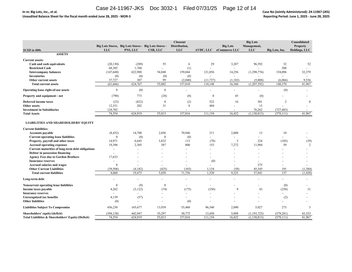 In re: Big Lots, Inc., et al. Unaudited Balance Sheet for the fiscal month ended June 28, 2025 - MOR-3 Case No (Jointly Administered): 24-11967 (JKS) Reporting Period: June 1, 2025 - June 28, 2025 $USD in 000s Big Lots Stores, LLC Big Lots Stores - PNS, LLC Big Lots Stores - CSR, LLC Closeout Distribution, LLC AVDC, LLC Big Lots eCommerce LLC Big Lots Management, LLC Big Lots, Inc. Consolidated Property Holdings, LLC ASSETS Current assets: Cash and cash equivalents (20,130) (289) 55 6 29 3,287 96,392 32 52 Restricted Cash 68,385 1,760 - (1) - - - 308 - Intercompany balances (147,648) 622,988 54,848 159,844 121,856 14,256 (1,298,776) 154,096 32,379 Inventories (0) (0) (0) (0) - - - - - Other current assets 37,727 307 99 (2,040) (11,737) (1,182) (5,008) (6,066) 9,536 Total current assets (61,666) 624,767 55,002 157,810 110,148 16,360 (1,207,392) 148,370 41,967 Operating lease right-of-use assets 0 (0) 0 - - - - (0) - Property and equipment - net (790) 773 (28) (0) 0 45 (0) - - Deferred income taxes (23) (822) 8 (2) 522 16 301 2 0 Other assets 12,331 202 31 8 484 - 15 - - Investment in Subsidiaries 124,702 - - - - - 76,262 (727,483) - Total Assets 74,554 624,919 55,013 157,816 111,154 16,422 (1,130,813) (579,111) 41,967 LIABILITIES AND SHAREHOLDERS' EQUITY Current liabilities: Accounts payable (8,432) 14,708 2,056 70,946 311 2,008 13 10 - Current operating lease liabilities 0 (0) 0 (0) - - - - - Property, payroll and other taxes 14,971 6,645 3,832 113 (78) 3 224 (103) (39) Accrued operating expenses 19,396 2,305 387 800 153 7,272 11,984 59 2 Current maturities of long-term debt obligations - - - - - - - - - Debtor in possession financing - - - - - - - - - Agency Fees due to Gordon Brothers 17,633 - - - - - - - - Insurance reserves - - - - (0) - - - - Accrued salaries and wages 0 - - - - - 275 - - Other Current Liabilities (39,508) (4,182) (425) (103) 1,134 (58) 45,345 191 (1,384) Total current liabilities 4,060 19,475 5,850 71,756 1,520 9,225 57,841 157 (1,420) Long-term debt - - - - - - - - - Noncurrent operating lease liabilities 0 (0) 0 - - - - (0) - Income taxes payable 4,262 (3,122) (74) (175) (356) 9 43 (258) 31 Insurance reserves - - - - - - - - - Unrecognized tax benefits 4,139 (57) - - - - - (2) - Other liabilities (0) - - (0) - - - - - Liabilities Subject To Compromise 456,230 165,677 13,939 55,460 96,540 2,090 5,027 273 3 Shareholders' equity/(deficit) (394,138) 442,947 35,297 30,775 13,450 5,098 (1,193,725) (579,281) 43,353 Total Liabilities & Shareholders' Equity/(Deficit) 74,554 624,919 55,013 157,816 111,154 16,422 (1,130,813) (579,111) 41,967 Case 24-11967-JKS Doc 3032-1 Filed 07/31/25 Page 12 of 14
