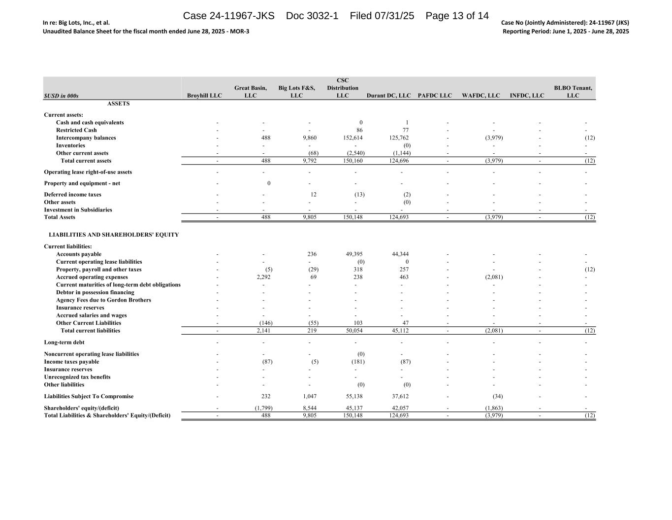 In re: Big Lots, Inc., et al. Unaudited Balance Sheet for the fiscal month ended June 28, 2025 - MOR-3 Case No (Jointly Administered): 24-11967 (JKS) Reporting Period: June 1, 2025 - June 28, 2025 $USD in 000s ASSETS Current assets: Cash and cash equivalents Restricted Cash Intercompany balances Inventories Other current assets Total current assets Operating lease right-of-use assets Property and equipment - net Deferred income taxes Other assets Investment in Subsidiaries Total Assets LIABILITIES AND SHAREHOLDERS' EQUITY Current liabilities: Accounts payable Current operating lease liabilities Property, payroll and other taxes Accrued operating expenses Current maturities of long-term debt obligations Debtor in possession financing Agency Fees due to Gordon Brothers Insurance reserves Accrued salaries and wages Other Current Liabilities Total current liabilities Long-term debt Noncurrent operating lease liabilities Income taxes payable Insurance reserves Unrecognized tax benefits Other liabilities Liabilities Subject To Compromise Shareholders' equity/(deficit) Total Liabilities & Shareholders' Equity/(Deficit) Broyhill LLC Great Basin, LLC Big Lots F&S, LLC CSC Distribution LLC Durant DC, LLC PAFDC LLC WAFDC, LLC INFDC, LLC BLBO Tenant, LLC - - - 0 1 - - - - - - - 86 77 - - - - - 488 9,860 152,614 125,762 - (3,979) - (12) - - - - (0) - - - - - - (68) (2,540) (1,144) - - - - - 488 9,792 150,160 124,696 - (3,979) - (12) - - - - - - - - - - 0 - - - - - - - - - 12 (13) (2) - - - - - - - - (0) - - - - - - - - - - - - - - 488 9,805 150,148 124,693 - (3,979) - (12) - - 236 49,395 44,344 - - - - - - - (0) 0 - - - - - (5) (29) 318 257 - - - (12) - 2,292 69 238 463 - (2,081) - - - - - - - - - - - - - - - - - - - - - - - - - - - - - - - - - - - - - - - - - - - - - - - - (146) (55) 103 47 - - - - - 2,141 219 50,054 45,112 - (2,081) - (12) - - - - - - - - - - - - (0) - - - - - - (87) (5) (181) (87) - - - - - - - - - - - - - - - - - - - - - - - - - (0) (0) - - - - - 232 1,047 55,138 37,612 - (34) - - - (1,799) 8,544 45,137 42,057 - (1,863) - - - 488 9,805 150,148 124,693 - (3,979) - (12) Case 24-11967-JKS Doc 3032-1 Filed 07/31/25 Page 13 of 14