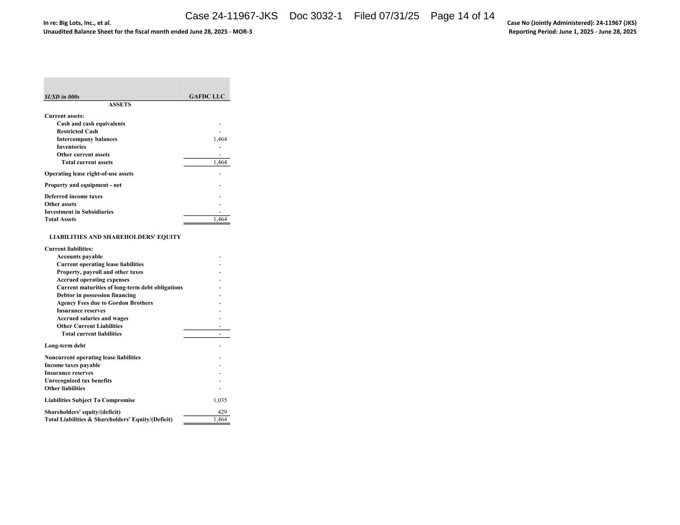 In re: Big Lots, Inc., et al. Unaudited Balance Sheet for the fiscal month ended June 28, 2025 - MOR-3 Case No (Jointly Administered): 24-11967 (JKS) Reporting Period: June 1, 2025 - June 28, 2025 $USD in 000s ASSETS Current assets: Cash and cash equivalents Restricted Cash Intercompany balances Inventories Other current assets Total current assets Operating lease right-of-use assets Property and equipment - net Deferred income taxes Other assets Investment in Subsidiaries Total Assets LIABILITIES AND SHAREHOLDERS' EQUITY Current liabilities: Accounts payable Current operating lease liabilities Property, payroll and other taxes Accrued operating expenses Current maturities of long-term debt obligations Debtor in possession financing Agency Fees due to Gordon Brothers Insurance reserves Accrued salaries and wages Other Current Liabilities Total current liabilities Long-term debt Noncurrent operating lease liabilities Income taxes payable Insurance reserves Unrecognized tax benefits Other liabilities Liabilities Subject To Compromise Shareholders' equity/(deficit) Total Liabilities & Shareholders' Equity/(Deficit) GAFDC LLC - - 1,464 - - 1,464 - - - - - 1,464 - - - - - - - - - - - - - - - - - 1,035 429 1,464 Case 24-11967-JKS Doc 3032-1 Filed 07/31/25 Page 14 of 14