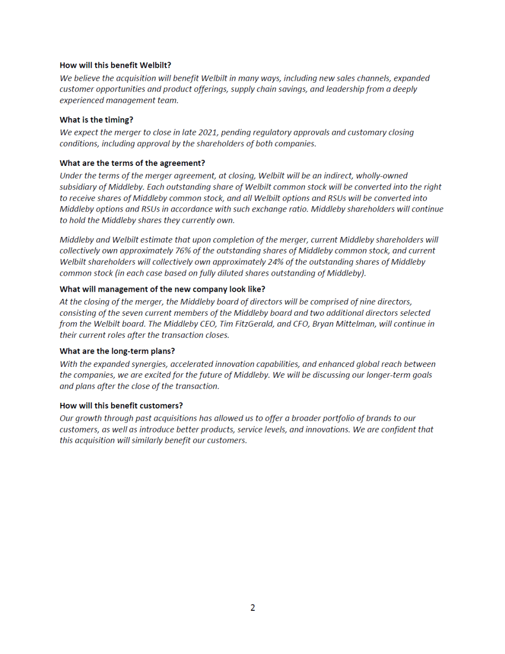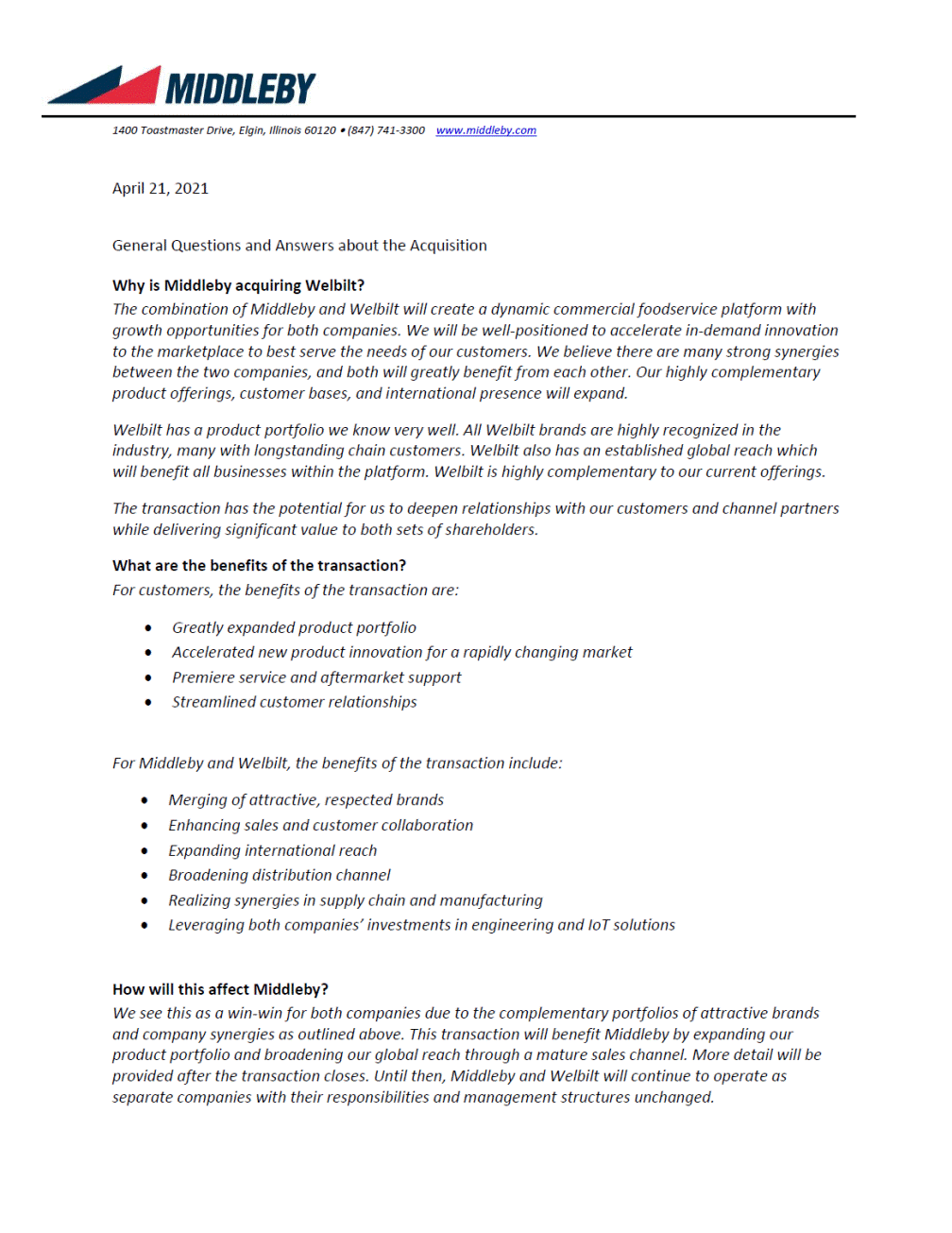 1400 Toastmaster Drive, Elgin, Illinois 60120 (847) 741-3300 www.middleby.com April 21, 2021 General Questions and Answers about the Acquisition Why is Middleby acquiring Welbilt? The combination of Middleby and Welbilt will create a dynamic commercial foodservice platform with growth opportunities for both companies. We will be well-positioned to accelerate in-demand innovation to the marketplace to best serve the needs of our customers. We believe there are many strong synergies between the two companies, and both will greatly benefit from each other. Our highly complementary product offerings, customer bases, and international presence will expand. Welbilt has a product portfolio we know very well. All Welbilt brands are highly recognized in the industry, many with longstanding chain customers. Welbilt also has an established global reach which will benefit all businesses within the platform. Welbilt is highly complementary to our current offerings. The transaction has the potential for us to deepen relationships with our customers and channel partners while delivering significant value to both sets of shareholders. What are the benefits of the transaction? For customers, the benefits of the transaction are: Greatly expanded product portfolio Accelerated new product innovation for a rapidly changing market Premiere service and aftermarket support Streamlined customer relationships For Middleby and Welbilt, the benefits of the transaction include: Merging of attractive, respected brands Enhancing sales and customer collaboration Expanding international reach Broadening distribution channel Realizing synergies in supply chain and manufacturing Leveraging both companies’ investments in engineering and IoT solutions How will this affect Middleby? We see this as a win-win for both companies due to the complementary portfolios of attractive brands and company synergies as outlined above. This transaction will benefit Middleby by expanding our product portfolio and broadening our global reach through a mature sales channel. More detail will be provided after the transaction closes. Until then, Middleby and Welbilt will continue to operate as separate companies with their responsibilities and management structures unchanged.