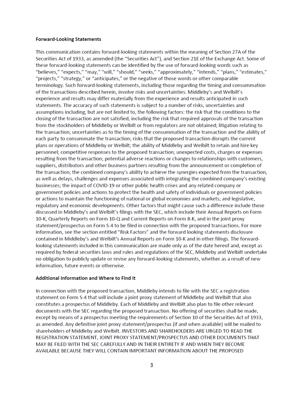 Forward-Looking Statements This communication contains forward-looking statements within the meaning of Section 27A of the Securities Act of 1933, as amended (the “Securities Act”), and Section 21E of the Exchange Act. Some of these forward-looking statements can be identified by the use of forward-looking words such as “believes,” “expects,” “may,” “will,” “should,” “seeks,” “approximately,” “intends,” “plans,” “estimates,” “projects,” “strategy,” or “anticipates,” or the negative of those words or other comparable terminology. Such forward-looking statements, including those regarding the timing and consummation of the transactions described herein, involve risks and uncertainties. Middleby’s and Welbilt’s experience and results may differ materially from the experience and results anticipated in such statements. The accuracy of such statements is subject to a number of risks, uncertainties and assumptions including, but are not limited to, the following factors: the risk that the conditions to the closing of the transaction are not satisfied, including the risk that required approvals of the transaction from the stockholders of Middleby or Welbilt or from regulators are not obtained; litigation relating to the transaction; uncertainties as to the timing of the consummation of the transaction and the ability of each party to consummate the transaction; risks that the proposed transaction disrupts the current plans or operations of Middleby or Welbilt; the ability of Middleby and Welbilt to retain and hire key personnel; competitive responses to the proposed transaction; unexpected costs, charges or expenses resulting from the transaction; potential adverse reactions or changes to relationships with customers, suppliers, distributors and other business partners resulting from the announcement or completion of the transaction; the combined company’s ability to achieve the synergies expected from the transaction, as well as delays, challenges and expenses associated with integrating the combined company’s existing businesses; the impact of COVID-19 or other public health crises and any related company or government policies and actions to protect the health and safety of individuals or government policies or actions to maintain the functioning of national or global economies and markets; and legislative, regulatory and economic developments. Other factors that might cause such a difference include those discussed in Middleby’s and Welbilt’s filings with the SEC, which include their Annual Reports on Form 10-K, Quarterly Reports on Form 10-Q and Current Reports on Form 8-K, and in the joint proxy statement/prospectus on Form S-4 to be filed in connection with the proposed transactions. For more information, see the section entitled “Risk Factors” and the forward looking statements disclosure contained in Middleby’s and Welbilt’s Annual Reports on Form 10-K and in other filings. The forward-looking statements included in this communication are made only as of the date hereof and, except as required by federal securities laws and rules and regulations of the SEC, Middleby and Welbilt undertake no obligation to publicly update or revise any forward-looking statements, whether as a result of new information, future events or otherwise. Additional Information and Where to Find It In connection with the proposed transaction, Middleby intends to file with the SEC a registration statement on Form S-4 that will include a joint proxy statement of Middleby and Welbilt that also constitutes a prospectus of Middleby. Each of Middleby and Welbilt also plan to file other relevant documents with the SEC regarding the proposed transaction. No offering of securities shall be made, except by means of a prospectus meeting the requirements of Section 10 of the Securities Act of 1933, as amended. Any definitive joint proxy statement/prospectus (if and when available) will be mailed to shareholders of Middleby and Welbilt. INVESTORS AND SHAREHOLDERS ARE URGED TO READ THE REGISTRATION STATEMENT, JOINT PROXY STATEMENT/PROSPECTUS AND OTHER DOCUMENTS THAT MAY BE FILED WITH THE SEC CAREFULLY AND IN THEIR ENTIRETY IF AND WHEN THEY BECOME AVAILABLE BECAUSE THEY WILL CONTAIN IMPORTANT INFORMATION ABOUT THE PROPOSED 3