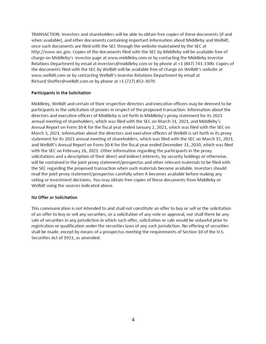 TRANSACTION. Investors and shareholders will be able to obtain free copies of these documents (if and when available), and other documents containing important information about Middleby and Welbilt, once such documents are filed with the SEC through the website maintained by the SEC at http://www.sec.gov. Copies of the documents filed with the SEC by Middleby will be available free of charge on Middleby’s investor page at www.middleby.com or by contacting the Middleby Investor Relations Department by email at investors@middleby.com or by phone at +1 (847) 741-3300. Copies of the documents filed with the SEC by Welbilt will be available free of charge on Welbilt’s website at www.welbilt.com or by contacting Welbilt’s Investor Relations Department by email at Richard.Sheffer@welbilt.com or by phone at +1 (727) 853-3079. Participants in the Solicitation Middleby, Welbilt and certain of their respective directors and executive officers may be deemed to be participants in the solicitation of proxies in respect of the proposed transaction. Information about the directors and executive officers of Middleby is set forth in Middleby’s proxy statement for its 2021 annual meeting of shareholders, which was filed with the SEC on March 31, 2021, and Middleby’s Annual Report on Form 10-K for the fiscal year ended January 2, 2021, which was filed with the SEC on March 3, 2021. Information about the directors and executive officers of Welbilt is set forth in its proxy statement for its 2021 annual meeting of shareholders, which was filed with the SEC on March 15, 2021, and Welbilt’s Annual Report on Form 10-K for the fiscal year ended December 31, 2020, which was filed with the SEC on February 26, 2021. Other information regarding the participants in the proxy solicitations and a description of their direct and indirect interests, by security holdings or otherwise, will be contained in the joint proxy statement/prospectus and other relevant materials to be filed with the SEC regarding the proposed transaction when such materials become available. Investors should read the joint proxy statement/prospectus carefully when it becomes available before making any voting or investment decisions. You may obtain free copies of these documents from Middleby or Welbilt using the sources indicated above. No Offer or Solicitation This communication is not intended to and shall not constitute an offer to buy or sell or the solicitation of an offer to buy or sell any securities, or a solicitation of any vote or approval, nor shall there be any sale of securities in any jurisdiction in which such offer, solicitation or sale would be unlawful prior to registration or qualification under the securities laws of any such jurisdiction. No offering of securities shall be made, except by means of a prospectus meeting the requirements of Section 10 of the U.S. Securities Act of 1933, as amended. 4