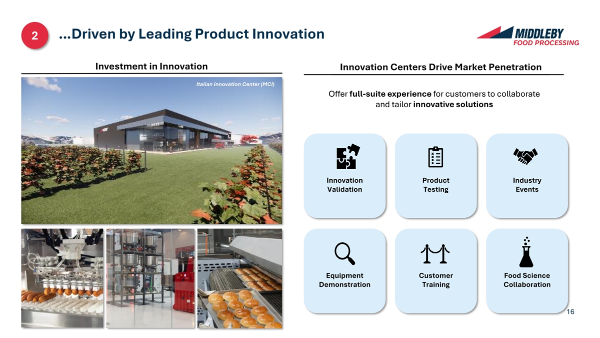 …Driven by Leading Product Innovation 2 Investment in Innovation Innovation Centers Drive Market Penetration Italian Innovation Center (MCI) Offer full-suite experience for customers to collaborate and tailor innovative solutions Innovation Product Industry Validation Testing Events Equipment Customer Food Science Demonstration Training Collaboration 16
