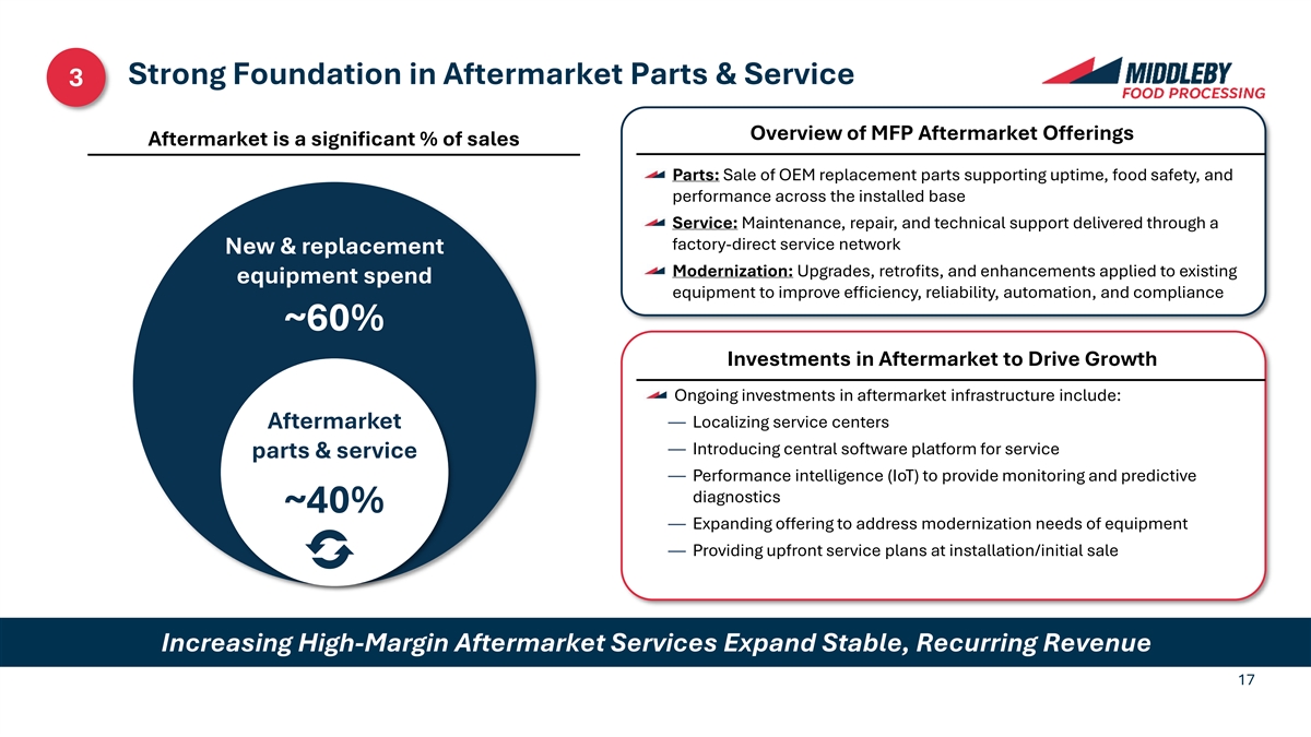 Strong Foundation in Aftermarket Parts & Service 3 Overview of MFP Aftermarket Offerings Aftermarket is a significant % of sales Parts: Sale of OEM replacement parts supporting uptime, food safety, and performance across the installed base \ Service: Maintenance, repair, and technical support delivered through a factory-direct service network New & replacement Modernization: Upgrades, retrofits, and enhancements applied to existing equipment spend equipment to improve efficiency, reliability, automation, and compliance ~60% Investments in Aftermarket to Drive Growth Ongoing investments in aftermarket infrastructure include: — Localizing service centers Aftermarket — Introducing central software platform for service parts & service \ — Performance intelligence (IoT) to provide monitoring and predictive diagnostics ~40% — Expanding offering to address modernization needs of equipment — Providing upfront service plans at installation/initial sale Increasing High-Margin Aftermarket Services Expand Stable, Recurring Revenue 17