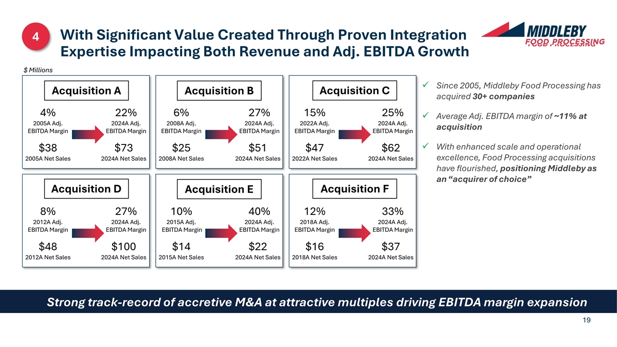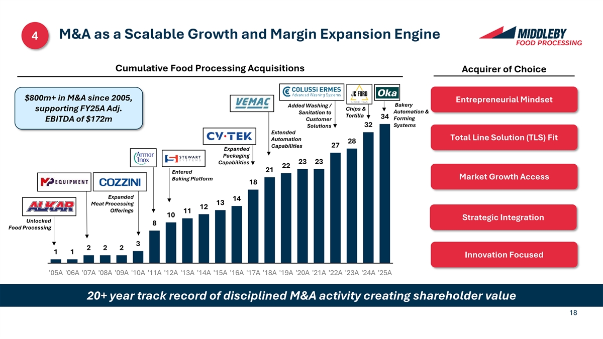 M&A as a Scalable Growth and Margin Expansion Engine 4 Cumulative Food Processing Acquisitions Acquirer of Choice $800m+ in M&A since 2005, Entrepreneurial Mindset Bakery Added Washing / Chips & supporting FY25A Adj. Automation & Sanitation to Tortilla 34 Forming Customer EBITDA of $172m Systems 32 Solutions Extended Total Line Solution (TLS) Fit Automation 28 27 Capabilities Expanded Packaging 23 23 Capabilities 22 21 Entered Market Growth Access Baking Platform 18 Expanded 14 13 Meat Processing 12 Offerings 11 10 Strategic Integration Unlocked 8 Food Processing 3 2 2 2 1 1 Innovation Focused '05A '06A '07A '08A '09A '10A '11A '12A '13A '14A '15A '16A '17A '18A '19A '20A '21A '22A '23A '24A '25A 20+ year track record of disciplined M&A activity creating shareholder value 18