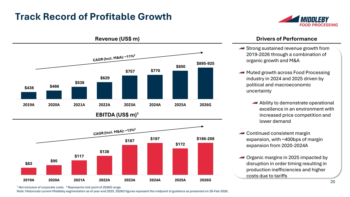 With Significant Value Created Through Proven Integration 4 Expertise Impacting Both Revenue and Adj. EBITDA Growth $ Millions ✓ Since 2005, Middleby Food Processing has Acquisition A Acquisition B Acquisition C acquired 30+ companies 4% 22% 6% 27% 15% 25% ✓ Average Adj. EBITDA margin of ~11% at 2005A Adj. 2024A Adj. 2008A Adj. 2024A Adj. 2022A Adj. 2024A Adj. acquisition EBITDA Margin EBITDA Margin EBITDA Margin EBITDA Margin EBITDA Margin EBITDA Margin ✓ With enhanced scale and operational $38 $73 $25 $51 $47 $62 2005A Net Sales 2024A Net Sales 2008A Net Sales 2024A Net Sales 2022A Net Sales 2024A Net Sales excellence, Food Processing acquisitions have flourished, positioning Middleby as an “acquirer of choice” Acquisition D Acquisition E Acquisition F 8% 27% 10% 40% 12% 33% 2012A Adj. 2024A Adj. 2015A Adj. 2024A Adj. 2018A Adj. 2024A Adj. EBITDA Margin EBITDA Margin EBITDA Margin EBITDA Margin EBITDA Margin EBITDA Margin $48 $100 $14 $22 $16 $37 2012A Net Sales 2024A Net Sales 2015A Net Sales 2024A Net Sales 2018A Net Sales 2024A Net Sales Strong track-record of accretive M&A at attractive multiples driving EBITDA margin expansion 19