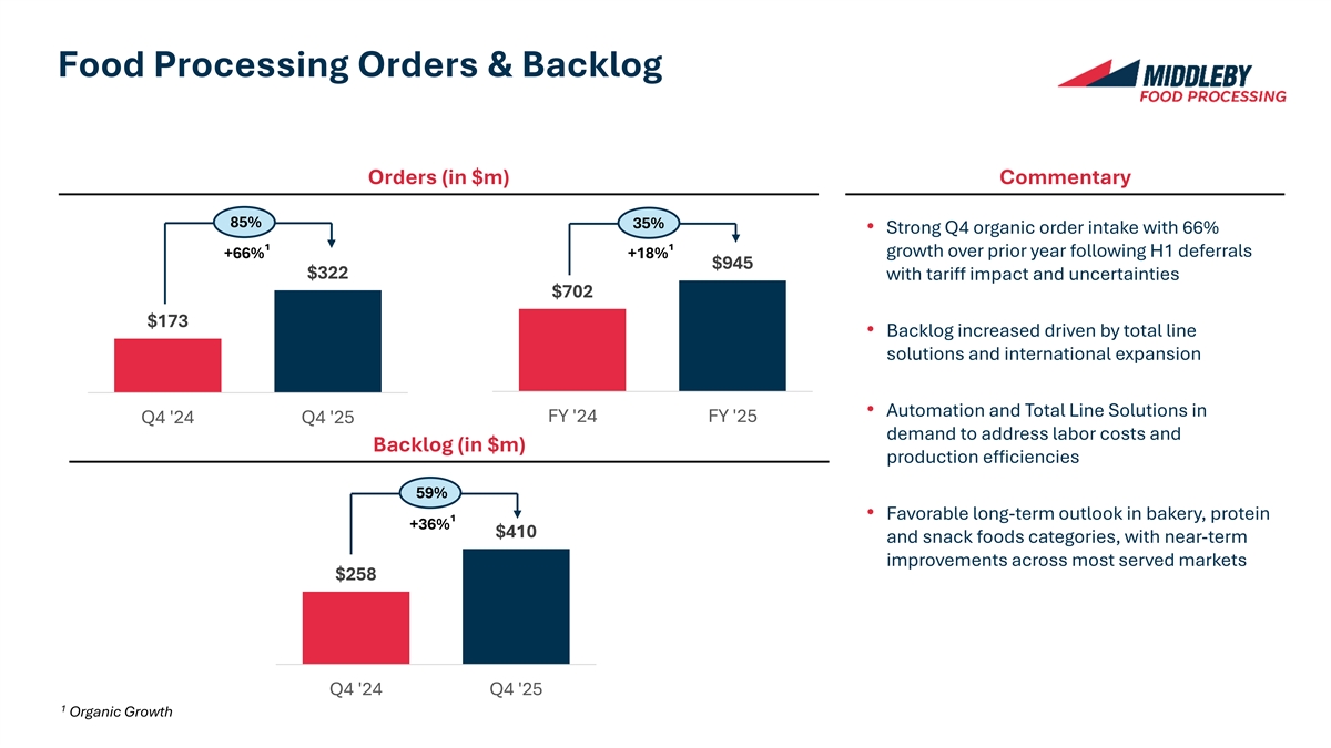 Food Processing Orders & Backlog Orders (in $m) Commentary 85% 35% • Strong Q4 organic order intake with 66% growth over prior year following H1 deferrals +66%¹ +18%¹ $945 $322 with tariff impact and uncertainties $702 $173 • Backlog increased driven by total line solutions and international expansion • Automation and Total Line Solutions in FY '24 FY '25 Q4 '24 Q4 '25 demand to address labor costs and Backlog (in $m) production efficiencies 59% • Favorable long-term outlook in bakery, protein +36%¹ $410 and snack foods categories, with near-term improvements across most served markets $258 Q4 '24 Q4 '25 1 Organic Growth