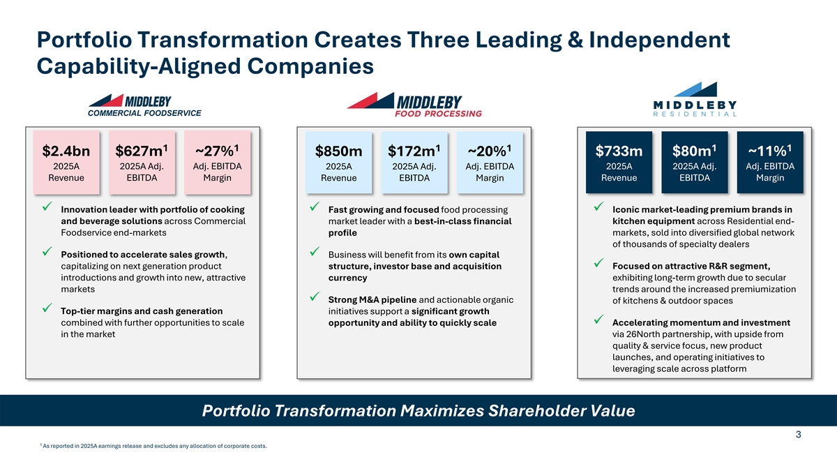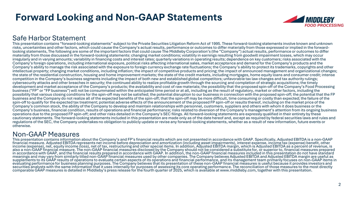 Forward Looking and Non-GAAP Statements Safe Harbor Statement This presentation contains “forward-looking statements” subject to the Private Securities Litigation Reform Act of 1995. These forward-looking statements involve known and unknown risks, uncertainties and other factors, which could cause the Company’s actual results, performance or outcomes to differ materially from those expressed or implied in the forward- looking statements, The following are some of the important factors that could cause The Middleby Corporation’s (the “Company”) actual results, performance or outcomes to differ materially from those discussed in the forward-looking statements: changing market conditions; volatility in earnings resulting from goodwill impairment losses, which may occur irregularly and in varying amounts; variability in financing costs and interest rates; quarterly variations in operating results; dependence on key customers; risks associated with the Company’s foreign operations, including international exposure, political risks affecting international sales, market acceptance and demand for the Company’s products and the Company’s ability to manage the risk associated with the exposure to foreign currency exchange rate fluctuations; the Company’s ability to protect its trademarks, copyrights and other intellectual property; changing market conditions, including inflation; the impact of competitive products and pricing; the impact of announced management and organizational changes; the state of the residential construction, housing and home improvement markets; the state of the credit markets, including mortgages, home equity loans and consumer credit; intense competition in the Company’s business segments including the impact of both new and established global competitors; unfavorable tax law changes and tax authority rulings; cybersecurity attacks and other breaches in security; the continued ability to realize profitable growth through the sourcing and completion of strategic acquisitions; the timely development and market acceptance of the Company’s products; the availability and cost of raw materials; the possibility that the proposed spin-off of the Company’s Food Processing business (“FP” or “FP business”) will not be consummated within the anticipated time period or at all, including as the result of regulatory, market or other factors, including the possibility that various closing conditions for the spin-off may not be satisfied; the potential disruption to our business in connection with the proposed spin-off; the potential that the FP business and the Company do not realize all of the expected benefits of the spin-off; that the spin-off may be more difficult, time consuming or costly than expected; the failure of the spin-off to qualify for the expected tax treatment; potential adverse effects of the announcement of the proposed FP spin-off or results thereof, including on the market price of the Company’s common stock, the ability of the Company to develop and maintain relationships with personnel, customers, suppliers and others with whom it does business or the Company’s business, financial condition, results of operations and financial performance; risks related to diversion of the Company’s management’s attention from its ongoing business operations due to the proposed FP spin-off; and other risks detailed in the Company’s SEC filings. All forward-looking statements are expressly qualified in their entirety by these cautionary statements. The forward-looking statements included in this presentation are made only as of the date hereof and, except as required by federal securities laws and rules and regulations of the SEC, the Company undertakes no obligation to publicly update or revise any forward-looking statements, whether as a result of new information, future events or otherwise. Non-GAAP Measures This presentation contains information about the Company’s and FP’s financial results which are not presented in accordance with GAAP. Specifically, Adjusted EBITDA is a non-GAAP financial measure. Adjusted EBITDA represents net income before depreciation and amortization (including asset impairments), interest expense, income tax (expense) benefit, other income (expense), net, equity income (loss), net of tax, restructuring and other special items. In addition, Adjusted EBITDA margin, which is Adjusted EBITDA as a percent of revenue, is also a non-GAAP financial measure. The non-GAAP financial measures disclosed by the Company should not be considered a substitute for, or superior to, financial measures prepared in accordance with GAAP, and the financial results prepared in accordance with GAAP. In addition, the non-GAAP financial measures included in this presentation do not have standard meanings and may vary from similarly titled non-GAAP financial measures used by other companies. The Company believes Adjusted EBITDA and Adjusted EBITDA margin are useful as supplements to its GAAP results of operations to evaluate certain aspects of its operations and financial performance, and its management team primarily focuses on non-GAAP items in evaluating performance for business planning purposes. The Company believes that its presentation of these non-GAAP financial measures is useful because it provides investors and securities analysts with the same information that it uses internally for purposes of assessing its core operating performance. The reconciliation of those measures to the most directly comparable GAAP measures is detailed in Middleby’s press release for the fourth quarter of 2025, which is available at www.middleby.com, together with this presentation. 2