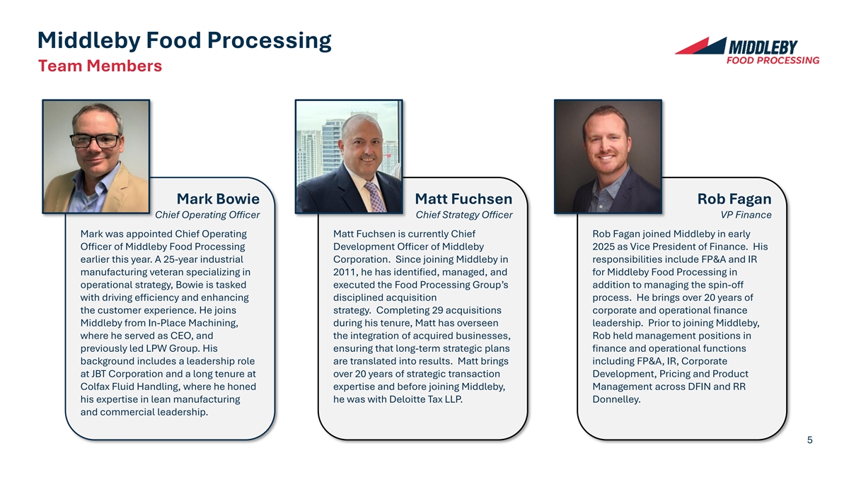 Middleby Food Processing Team Members Mark Bowie Matt Fuchsen Rob Fagan Chief Operating Officer Chief Strategy Officer VP Finance Mark was appointed Chief Operating Matt Fuchsen is currently Chief Rob Fagan joined Middleby in early Officer of Middleby Food Processing Development Officer of Middleby 2025 as Vice President of Finance. His earlier this year. A 25-year industrial Corporation. Since joining Middleby in responsibilities include FP&A and IR manufacturing veteran specializing in 2011, he has identified, managed, and for Middleby Food Processing in operational strategy, Bowie is tasked executed the Food Processing Group’s addition to managing the spin-off with driving efficiency and enhancing disciplined acquisition process. He brings over 20 years of the customer experience. He joins strategy. Completing 29 acquisitions corporate and operational finance Middleby from In-Place Machining, during his tenure, Matt has overseen leadership. Prior to joining Middleby, where he served as CEO, and the integration of acquired businesses, Rob held management positions in previously led LPW Group. His ensuring that long-term strategic plans finance and operational functions background includes a leadership role are translated into results. Matt brings including FP&A, IR, Corporate at JBT Corporation and a long tenure at over 20 years of strategic transaction Development, Pricing and Product Colfax Fluid Handling, where he honed expertise and before joining Middleby, Management across DFIN and RR his expertise in lean manufacturing he was with Deloitte Tax LLP. Donnelley. and commercial leadership. 5