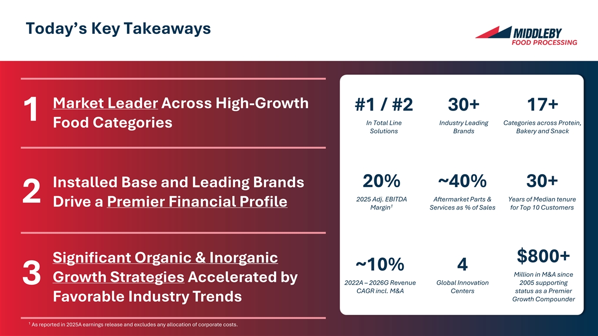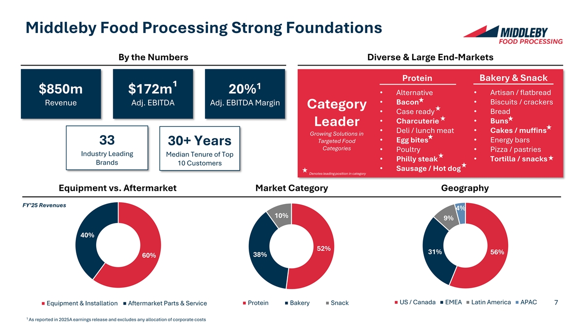 Today’s Key Takeaways Market Leader Across High-Growth #1 / #2 30+ 17+ 1 In Total Line Industry Leading Categories across Protein, Food Categories Solutions Brands Bakery and Snack Installed Base and Leading Brands 20% ~40% 30+ 2025 Adj. EBITDA Aftermarket Parts & Years of Median tenure 2 Drive a Premier Financial Profile 1 Margin Services as % of Sales for Top 10 Customers Significant Organic & Inorganic $800+ ~10% 4 Million in M&A since Growth Strategies Accelerated by 3 2022A – 2026G Revenue Global Innovation 2005 supporting CAGR incl. M&A Centers status as a Premier Growth Compounder Favorable Industry Trends 6 [ ] 1 As reported in 2025A earnings release and excludes any allocation of corporate costs.
