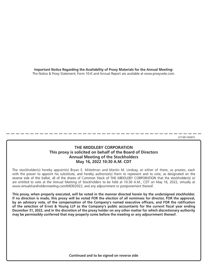 | 3. | To ratify the selection of Ernst & Young LLP as Middleby’s independent public accountants for the fiscal year ending December 31, 2022. |