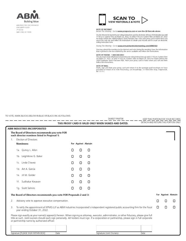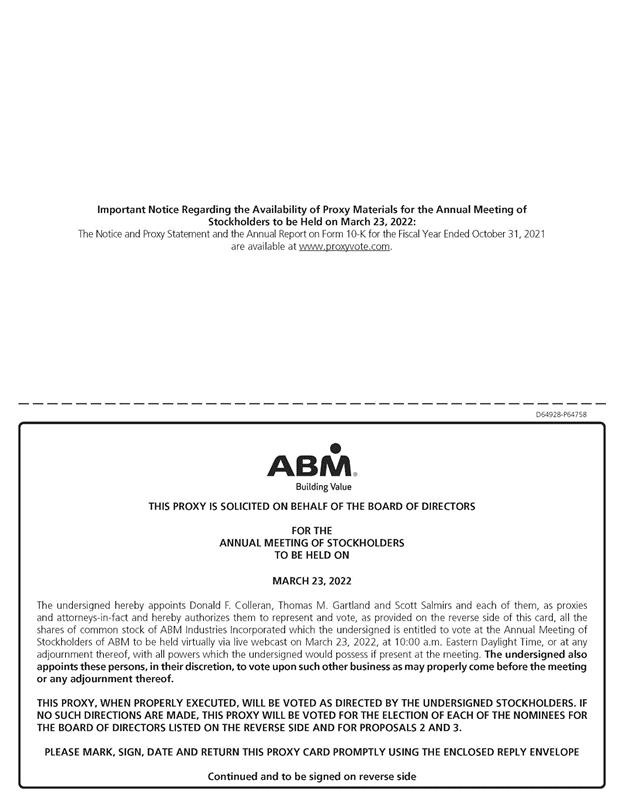 Important Notice Regarding the Availability of Proxy Materials for the Annual Meeting of Stockholders to be Held on March 23, 2022: The Notice and Proxy Statement and the Annual Report on Form 10-K for the Fiscal Year Ended October 31, 2021 are available at www.proxyvote.com. THIS PROXY IS SOLICITED ON BEHALF OF THE BOARD OF DIRECTORS FOR THE ANNUAL MEETING OF STOCKHOLDERS TO BE HELD ON MARCH 23, 2022 The undersigned hereby appoints Donald F. Colleran, Thomas M. Gartland and Scott Salmirs and each of them, as proxies and attorneys-in-fact and hereby authorizes them to represent and vote, as provided on the reverse side of this card, all the shares of common stock of ABM Industries Incorporated which the undersigned is entitled to vote at the Annual Meeting of Stockholders of ABM to be held virtually via live webcast on March 23, 2022, at 10:00 a.m. Eastern Daylight Time, or at any adjournment thereof, with all powers which the undersigned would possess if present at the meeting. The undersigned also appoints these persons, in their discretion, to vote upon such other business as may properly come before the meeting or any adjournment thereof. THIS PROXY, WHEN PROPERLY EXECUTED, WILL BE VOTED AS DIRECTED BY THE UNDERSIGNED STOCKHOLDERS. IF NO SUCH DIRECTIONS ARE MADE, THIS PROXY WILL BE VOTED FOR THE ELECTION OF EACH OF THE NOMINEES FOR THE BOARD OF DIRECTORS LISTED ON THE REVERSE SIDE AND FOR PROPOSALS 2 AND 3. PLEASE MARK, SIGN, DATE AND RETURN THIS PROXY CARD PROMPTLY USING THE ENCLOSED REPLY ENVELOPE Continued and to be signed on reverse side D64928-P64758