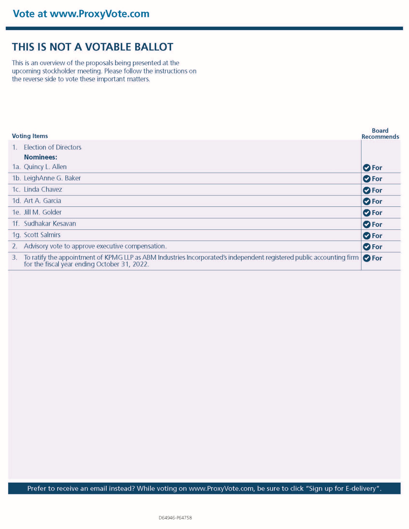 Vote at www.ProxyVote.com THIS IS NOT A VOTABLE BALLOT This is an overview of the proposals being presented at the upcoming stockholder meeting. Please follow the instructions on the reverse side to vote these important matters. Voting Items Board Recommends 1. Election of Directors Nominees: 1a. Quincy L. Allen For 1b. LeighAnne G. Baker For 1c. Linda Chavez For 1d. Art A. Garcia For 1e. Jill M. Golder For 1f. Sudhakar Kesavan For 1g. Scott Salmirs For 2. Advisory vote to approve executive compensation. For 3. To ratify the appointment of KPMG LLP as ABM Industries Incorporated’s independent registered public accounting firm for the fiscal year ending October 31, 2022. Prefer to receive an email instead? While voting on www.ProxyVote.com, be sure to click “Sign up for E-delivery”. D64946-P64758