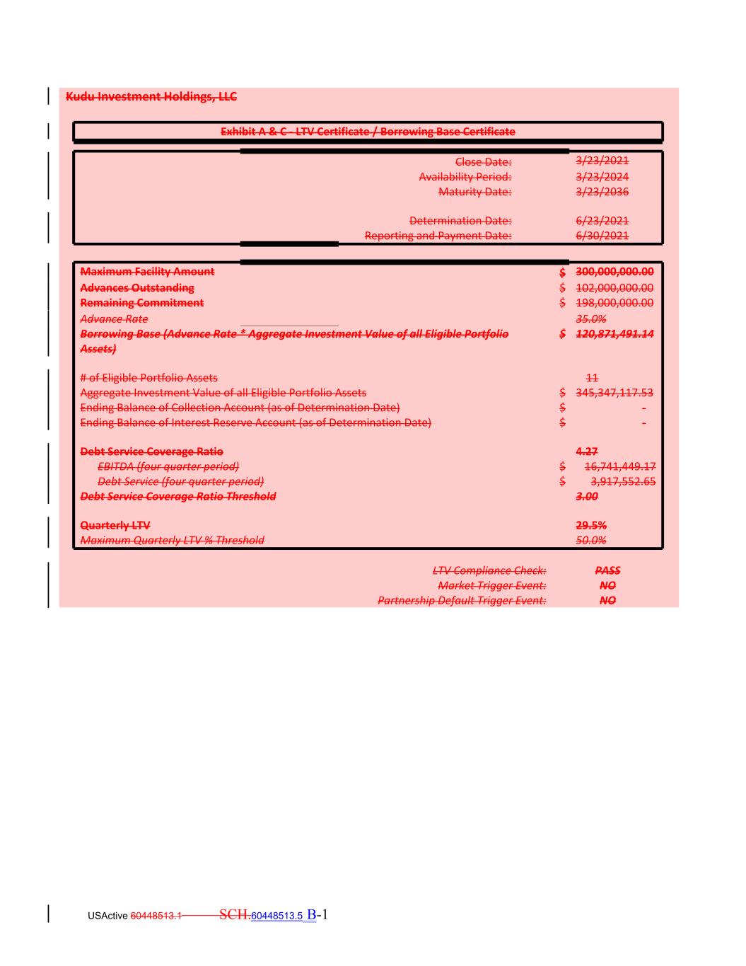 USActive 60448513.1 SCH.60448513.5 B-1 6/23/2021 Borrowing Base (Advance Rate * Aggregate Investment Value of all Eligible Portfolio Assets) $ 120,871,491.14 Reporting and Payment Date: Availability Period: 6/30/2021 # of Eligible Portfolio Assets 3/23/2024 11 Aggregate Investment Value of all Eligible Portfolio Assets $ 345,347,117.53 Ending Balance of Collection Account (as of Determination Date) $ ‐ Ending Balance of Interest Reserve Account (as of Determination Date) Exhibit A & C ‐ LTV Certificate / Borrowing Base Certificate $ ‐ Maximum Facility Amount Kudu Investment Holdings, LLC $ Maturity Date: 300,000,000.00 Debt Service Coverage Ratio 3/23/2036 4.27 Advances Outstanding EBITDA (four quarter period) $ 16,741,449.17 $ 102,000,000.00 Debt Service (four quarter period) $ 3,917,552.65 Debt Service Coverage Ratio Threshold Remaining Commitment 3.00 $ 198,000,000.00 Close Date: Quarterly LTV 29.5% Maximum Quarterly LTV % Threshold 3/23/2021 50.0% LTV Compliance Check: PASS Advance Rate Market Trigger Event: NO Partnership Default Trigger Event: Determination Date: NO 35.0%