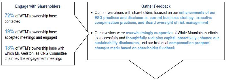 Over the last year, members of the Board and management reached out to shareholders owning 72% of White Mountains’s shares outstanding and met with all of those shareholders who accepted a meeting, who represented 19% of our shares outstanding. Over the past several years, feedback received from these discussions has helped guide changes to our executive compensation program and to enhance our disclosures about the skills and areas of expertise of our Board and our risk management and human capital management practices in general. This year our discussions with shareholders focused on our business strategy, corporate governance, the composition of our Board and enhancements to our ESG disclosures.