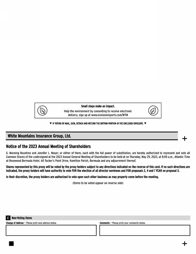 Small steps make an impact. Help the environment by consenting to receive electronic delivery, sign up at www.envisionreports.com/WTM Notice of the 2023 Annual Meeting of Shareholders G. Manning Rountree and Jennifer L. Moyer, or either of them, each with the full power of substitution, are hereby authorized to represent and vote all Common Shares of the undersigned at the 2023 Annual General Meeting of Shareholders to be held at on Thursday, May 25, 2023, at 8:00 a.m., Atlantic Time at Rosewood Bermuda Hotel, 60 Tuckers Point Drive, Hamilton Parish, Bermuda and any adjournment thereof. Shares represented by this proxy will be voted by the proxy holders subject to any directions indicated on the reverse of this card. If no such directions are indicated, the proxy holders will have authority to vote FOR the election of all director nominees and FOR proposals 2, 4 and 1 YEAR on proposal 3. In their discretion, the proxy holders are authorized to vote upon such other business as may properly come before the meeting. (Items to be voted appear on reverse side) White Mountains Insurance Group, Ltd. qIF VOTING BY MAIL, SIGN, DETACH AND RETURN THE BOTTOM PORTION IN THE ENCLOSED ENVELOPE.q Change of Address Please print new address below. Comments Please print your comments below. C Non-Voting Items +