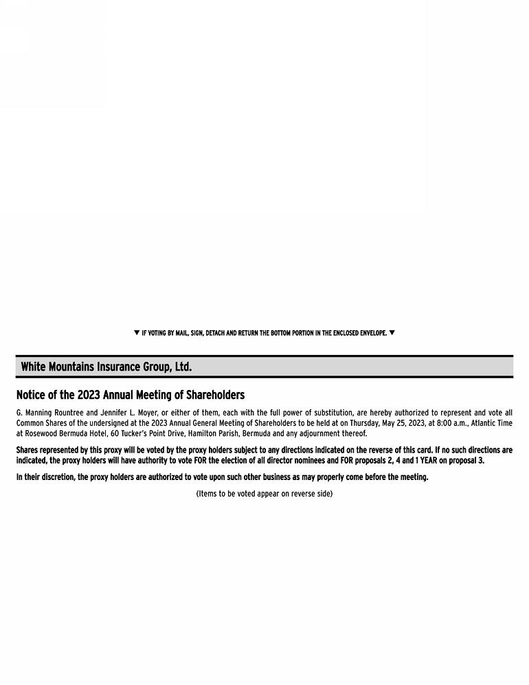White Mountains Insurance Group, Ltd. qIF VOTING BY MAIL, SIGN, DETACH AND RETURN THE BOTTOM PORTION IN THE ENCLOSED ENVELOPE.q Notice of the 2023 Annual Meeting of Shareholders G. Manning Rountree and Jennifer L. Moyer, or either of them, each with the full power of substitution, are hereby authorized to represent and vote all Common Shares of the undersigned at the 2023 Annual General Meeting of Shareholders to be held at on Thursday, May 25, 2023, at 8:00 a.m., Atlantic Time at Rosewood Bermuda Hotel, 60 Tuckers Point Drive, Hamilton Parish, Bermuda and any adjournment thereof. Shares represented by this proxy will be voted by the proxy holders subject to any directions indicated on the reverse of this card. If no such directions are indicated, the proxy holders will have authority to vote FOR the election of all director nominees and FOR proposals 2, 4 and 1 YEAR on proposal 3. In their discretion, the proxy holders are authorized to vote upon such other business as may properly come before the meeting. (Items to be voted appear on reverse side)
