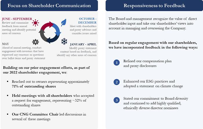 For more information on our commitment to ongoing shareholder engagement and details of our 2022 shareholder outreach, please refer to page 18 of the proxy statement.