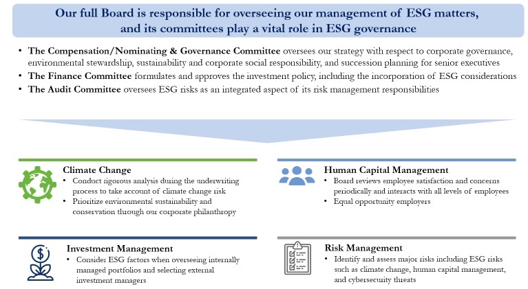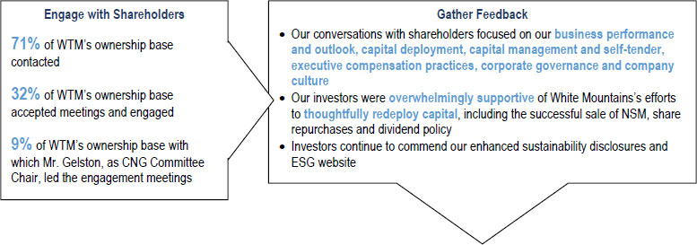 Over the last year, members of the Board and management reached out to shareholders owning 71% of White Mountains’s shares outstanding and met with all shareholders--representing 32% of our shares outstanding--who accepted a meeting. Feedback from these shareholder discussions over the past few years has informed changes to our executive compensation program, enhanced disclosures about the skills and areas of expertise of our Board, and improvements to our ESG, risk management and human capital management practices. This year, these shareholder discussions focused primarily on our business strategy, corporate governance--including the structure and the composition of our Board--and compensation philosophy. Shareholders were overwhelmingly supportive, while also providing valuable feedback, which we have used to further enhance our proxy statement disclosures.