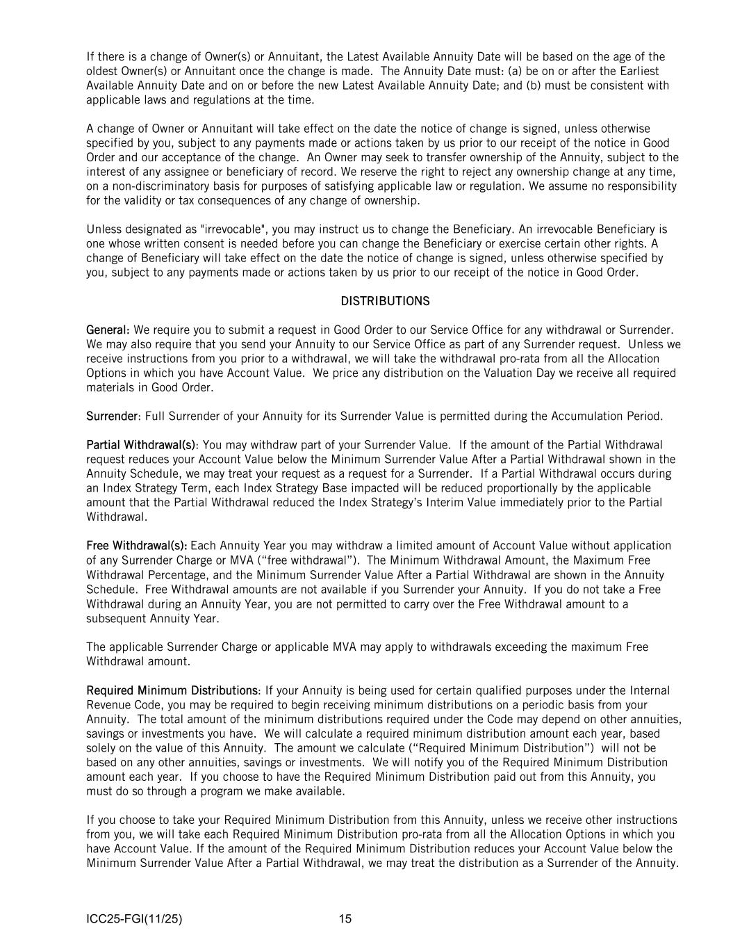 ICC25-FGI(11/25) 15 If there is a change of Owner(s) or Annuitant, the Latest Available Annuity Date will be based on the age of the oldest Owner(s) or Annuitant once the change is made. The Annuity Date must: (a) be on or after the Earliest Available Annuity Date and on or before the new Latest Available Annuity Date; and (b) must be consistent with applicable laws and regulations at the time. A change of Owner or Annuitant will take effect on the date the notice of change is signed, unless otherwise specified by you, subject to any payments made or actions taken by us prior to our receipt of the notice in Good Order and our acceptance of the change. An Owner may seek to transfer ownership of the Annuity, subject to the interest of any assignee or beneficiary of record. We reserve the right to reject any ownership change at any time, on a non-discriminatory basis for purposes of satisfying applicable law or regulation. We assume no responsibility for the validity or tax consequences of any change of ownership. Unless designated as "irrevocable", you may instruct us to change the Beneficiary. An irrevocable Beneficiary is one whose written consent is needed before you can change the Beneficiary or exercise certain other rights. A change of Beneficiary will take effect on the date the notice of change is signed, unless otherwise specified by you, subject to any payments made or actions taken by us prior to our receipt of the notice in Good Order. DISTRIBUTIONS General: We require you to submit a request in Good Order to our Service Office for any withdrawal or Surrender. We may also require that you send your Annuity to our Service Office as part of any Surrender request. Unless we receive instructions from you prior to a withdrawal, we will take the withdrawal pro-rata from all the Allocation Options in which you have Account Value. We price any distribution on the Valuation Day we receive all required materials in Good Order. Surrender: Full Surrender of your Annuity for its Surrender Value is permitted during the Accumulation Period. Partial Withdrawal(s): You may withdraw part of your Surrender Value. If the amount of the Partial Withdrawal request reduces your Account Value below the Minimum Surrender Value After a Partial Withdrawal shown in the Annuity Schedule, we may treat your request as a request for a Surrender. If a Partial Withdrawal occurs during an Index Strategy Term, each Index Strategy Base impacted will be reduced proportionally by the applicable amount that the Partial Withdrawal reduced the Index Strategy’s Interim Value immediately prior to the Partial Withdrawal. Free Withdrawal(s): Each Annuity Year you may withdraw a limited amount of Account Value without application of any Surrender Charge or MVA (“free withdrawal”). The Minimum Withdrawal Amount, the Maximum Free Withdrawal Percentage, and the Minimum Surrender Value After a Partial Withdrawal are shown in the Annuity Schedule. Free Withdrawal amounts are not available if you Surrender your Annuity. If you do not take a Free Withdrawal during an Annuity Year, you are not permitted to carry over the Free Withdrawal amount to a subsequent Annuity Year. The applicable Surrender Charge or applicable MVA may apply to withdrawals exceeding the maximum Free Withdrawal amount. Required Minimum Distributions: If your Annuity is being used for certain qualified purposes under the Internal Revenue Code, you may be required to begin receiving minimum distributions on a periodic basis from your Annuity. The total amount of the minimum distributions required under the Code may depend on other annuities, savings or investments you have. We will calculate a required minimum distribution amount each year, based solely on the value of this Annuity. The amount we calculate (“Required Minimum Distribution”) will not be based on any other annuities, savings or investments. We will notify you of the Required Minimum Distribution amount each year. If you choose to have the Required Minimum Distribution paid out from this Annuity, you must do so through a program we make available. If you choose to take your Required Minimum Distribution from this Annuity, unless we receive other instructions from you, we will take each Required Minimum Distribution pro-rata from all the Allocation Options in which you have Account Value. If the amount of the Required Minimum Distribution reduces your Account Value below the Minimum Surrender Value After a Partial Withdrawal, we may treat the distribution as a Surrender of the Annuity.
