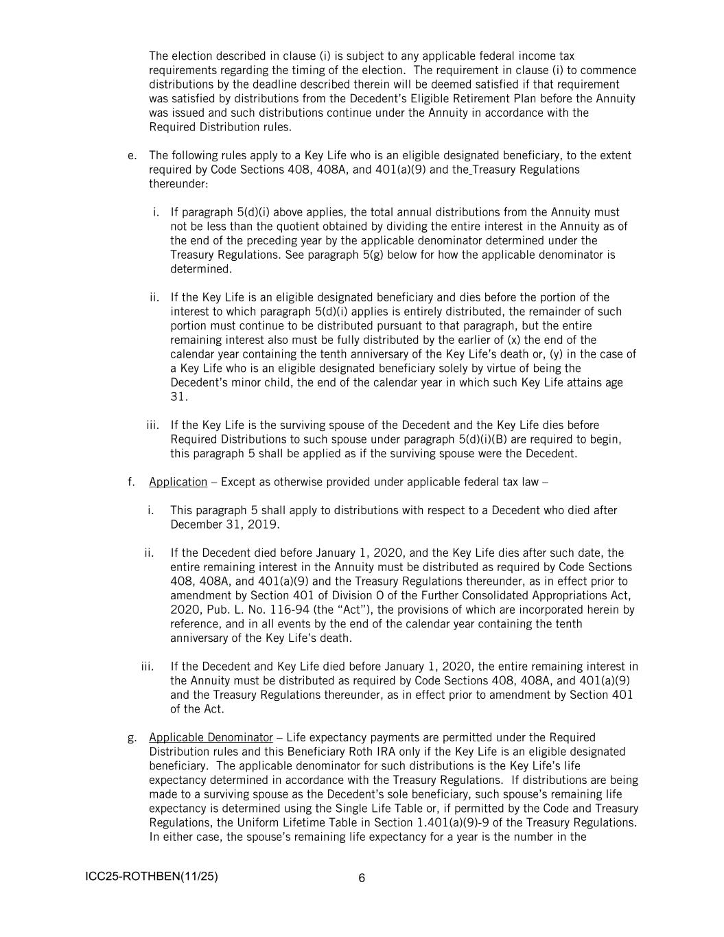 ICC25-ROTHBEN(11/25) 6 The election described in clause (i) is subject to any applicable federal income tax requirements regarding the timing of the election. The requirement in clause (i) to commence distributions by the deadline described therein will be deemed satisfied if that requirement was satisfied by distributions from the Decedent’s Eligible Retirement Plan before the Annuity was issued and such distributions continue under the Annuity in accordance with the Required Distribution rules. e. The following rules apply to a Key Life who is an eligible designated beneficiary, to the extent required by Code Sections 408, 408A, and 401(a)(9) and the Treasury Regulations thereunder: i. If paragraph 5(d)(i) above applies, the total annual distributions from the Annuity must not be less than the quotient obtained by dividing the entire interest in the Annuity as of the end of the preceding year by the applicable denominator determined under the Treasury Regulations. See paragraph 5(g) below for how the applicable denominator is determined. ii. If the Key Life is an eligible designated beneficiary and dies before the portion of the interest to which paragraph 5(d)(i) applies is entirely distributed, the remainder of such portion must continue to be distributed pursuant to that paragraph, but the entire remaining interest also must be fully distributed by the earlier of (x) the end of the calendar year containing the tenth anniversary of the Key Life’s death or, (y) in the case of a Key Life who is an eligible designated beneficiary solely by virtue of being the Decedent’s minor child, the end of the calendar year in which such Key Life attains age 31. iii. If the Key Life is the surviving spouse of the Decedent and the Key Life dies before Required Distributions to such spouse under paragraph 5(d)(i)(B) are required to begin, this paragraph 5 shall be applied as if the surviving spouse were the Decedent. f. Application – Except as otherwise provided under applicable federal tax law – i. This paragraph 5 shall apply to distributions with respect to a Decedent who died after December 31, 2019. ii. If the Decedent died before January 1, 2020, and the Key Life dies after such date, the entire remaining interest in the Annuity must be distributed as required by Code Sections 408, 408A, and 401(a)(9) and the Treasury Regulations thereunder, as in effect prior to amendment by Section 401 of Division O of the Further Consolidated Appropriations Act, 2020, Pub. L. No. 116-94 (the “Act”), the provisions of which are incorporated herein by reference, and in all events by the end of the calendar year containing the tenth anniversary of the Key Life’s death. iii. If the Decedent and Key Life died before January 1, 2020, the entire remaining interest in the Annuity must be distributed as required by Code Sections 408, 408A, and 401(a)(9) and the Treasury Regulations thereunder, as in effect prior to amendment by Section 401 of the Act. g. Applicable Denominator – Life expectancy payments are permitted under the Required Distribution rules and this Beneficiary Roth IRA only if the Key Life is an eligible designated beneficiary. The applicable denominator for such distributions is the Key Life’s life expectancy determined in accordance with the Treasury Regulations. If distributions are being made to a surviving spouse as the Decedent’s sole beneficiary, such spouse’s remaining life expectancy is determined using the Single Life Table or, if permitted by the Code and Treasury Regulations, the Uniform Lifetime Table in Section 1.401(a)(9)-9 of the Treasury Regulations. In either case, the spouse’s remaining life expectancy for a year is the number in the