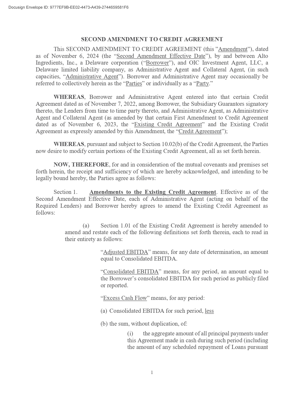 SECOND AMENDMENT TO CREDIT AGREEMENT This SECOND AMENDMENT TO CREDIT AGREEMENT (this Amendment ), dated as of November 6 , 2024 (the Second Amendment Effective Date ), by and between Alto Ingredients, Inc . , a Delaware corporation ( Borrower ), and OIC Investment Agent, LLC, a Delaware limited liability company, as Administrative Agent and Collateral Agent, (in such capacities, Administrative Agent ) . Borrower and Administrative Agent may occasionally be referred to collectively herein as the Parties or individually as a Party . WHEREAS , Borrower and Administrative Agent entered into that certain Credit Agreement dated as of November 7 , 2022 , among Borrower, the Subsidiary Guarantors signatory thereto, the Lenders from time to time party thereto, and Administrative Agent, as Administrative Agent and Collateral Agent (as amended by that certain First Amendment to Credit Agreement dated as of November 6 , 2023 , the Existing Credit Agreement and the Existing Credit Agreement as expressly amended by this Amendment, the Credit Agreement ) ; WHEREAS , pursuant and subject to Section 10 . 02 (b) of the Credit Agreement, the Parties now desire to modify certain portions of the Existing Credit Agreement, all as set forth herein . NOW, THEREFORE , for and in consideration of the mutual covenants and premises set forth herein, the receipt and sufficiency of which are hereby acknowledged, and intending to be legally bound hereby, the Parties agree as follows : Section 1 . Amendments to the Existing Credit Agreement . Effective as of the Second Amendment Effective Date, each of Administrative Agent (acting on behalf of the Required Lenders) and Borrower hereby agrees to amend the Existing Credit Agreement as follows : (a) Section 1 . 01 of the Existing Credit Agreement is hereby amended to amend and restate each of the following definitions set forth therein, each to read in their entirety as follows : Adjusted EBITDA means, for any date of determination, an amount equal to Consolidated EBITDA. Consolidated EBITDA means, for any period, an amount equal to consolidated EBITDA for such period as publicly filed or reported. Excess Cash Flow means, for any period: (a) Consolidated EBITDA for such period, less (b) the sum, without duplication, of : (i) the aggregate amount of all principal payments under this Agreement made in cash during such period (including the amount of any scheduled repayment of Loans pursuant 1