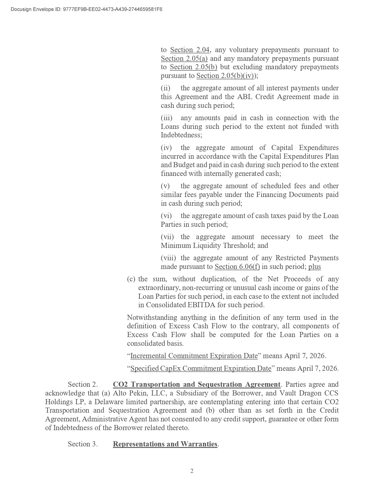 to Section 2 . 04 , any voluntary prepayments pursuant to Section 2 . 05 (a) and any mandatory prepayments pursuant to Section 2 . 05 (b) but excluding mandatory prepayments pursuant to Section 2 . 05 (b)(iv) ) ; (ii) the aggregate amount of all interest payments under this Agreement and the ABL Credit Agreement made in cash during such period ; (iii) any amounts paid in cash in connection with the Loans during such period to the extent not funded with Indebtedness ; (iv) the aggregate amount of Capital Expenditures incurred in accordance with the Capital Expenditures Plan and Budget and paid in cash during such period to the extent financed with internally generated cash ; (v) the aggregate amount of scheduled fees and other similar fees payable under the Financing Documents paid in cash during such period ; (vi) the aggregate amount of cash taxes paid by the Loan Parties in such period ; (vii) the aggregate amount necessary to meet the Minimum Liquidity Threshold ; and (viii) the aggregate amount of any Restricted Payments made pursuant to Section 6 . 06 (f) in such period ; plus (c) the sum, without duplication, of the Net Proceeds of any extraordinary, non - recurring or unusual cash income or gains of the Loan Parties for such period, in each case to the extent not included in Consolidated EBITDA for such period . Notwithstanding anything in the definition of any term used in the definition of Excess Cash Flow to the contrary, all components of Excess Cash Flow shall be computed for the Loan Parties on a consolidated basis . Incremental Commitment Expiration Date means April 7 , 2026 . Specified CapEx Commitment Expiration Date means April 7 , 2026 . Section 2 . CO 2 Transportation and Sequestration Agreement . Parties agree and acknowledge that (a) Alto Pekin, LLC, a Subsidiary of the Borrower, and Vault Dragon CCS Holdings LP, a Delaware limited partnership, are contemplating entering into that certain CO 2 Transportation and Sequestration Agreement and (b) other than as set forth in the Credit Agreement, Administrative Agent has not consented to any credit support, guarantee or other form of Indebtedness of the Borrower related thereto . Section 3. Representations and Warranties . 2