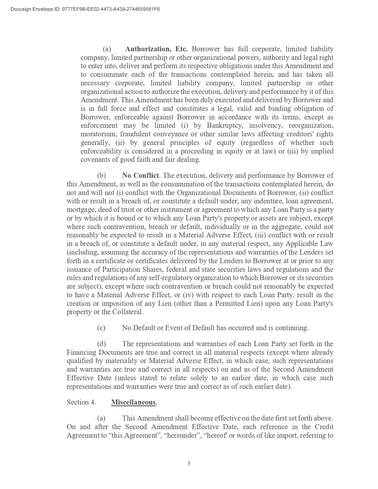 (a) Authorization, Etc . Borrower has full corporate, limited liability company, limited partnership or other organizational powers, authority and legal right to enter into, deliver and perform its respective obligations under this Amendment and to consummate each of the transactions contemplated herein, and has taken all necessary corporate, limited liability company, limited partnership or other organizational action to authorize the execution, delivery and performance by it of this Amendment . This Amendment has been duly executed and delivered by Borrower and is in full force and effect and constitutes a legal, valid and binding obligation of Borrower, enforceable against Borrower in accordance with its terms, except as enforcement may be limited (i) by Bankruptcy, insolvency, reorganization, moratorium, fraudulent conveyance or other similar laws affecting creditors' rights generally, (ii) by general principles of equity (regardless of whether such enforceability is considered in a proceeding in equity or at law) or (iii) by implied covenants of good faith and fair dealing . (b) No Conflict . The execution, delivery and performance by Borrower of this Amendment, as well as the consummation of the transactions contemplated herein, do not and will not (i) conflict with the Organizational Documents of Borrower, (ii) conflict with or result in a breach of, or constitute a default under, any indenture, loan agreement, mortgage, deed of trust or other instrument or agreement to which any Loan Party is a party or by which it is bound or to which any Loan Party's property or assets are subject, except where such contravention, breach or default, individually or in the aggregate, could not reasonably be expected to result in a Material Adverse Effect, (iii) conflict with or result in a breach of, or constitute a default under, in any material respect, any Applicable Law (including, assuming the accuracy of the representations and warranties of the Lenders set forth in a certificate or certificates delivered by the Lenders to Borrower at or prior to any issuance of Participation Shares, federal and state securities laws and regulations and the rules and regulations of any self - regulatory organization to which Borrower or its securities are subject), except where such contravention or breach could not reasonably be expected to have a Material Adverse Effect, or (iv) with respect to each Loan Party, result in the creation or imposition of any Lien (other than a Permitted Lien) upon any Loan Party's property or the Collateral . (c) No Default or Event of Default has occurred and is continuing. (d) The representations and warranties of each Loan Party set forth in the Financing Documents are true and correct in all material respects (except where already qualified by materiality or Material Adverse Effect, in which case, such representations and warranties are true and correct in all respects) on and as of the Second Amendment Effective Date (unless stated to relate solely to an earlier date, in which case such representations and warranties were true and correct as of such earlier date) . Section 4. Miscellaneous . (a) This Amendment shall become effective on the date first set forth above . On and after the Second Amendment Effective Date, each reference in the Credit Agreement to this Agreement , hereunder , hereof' or words of like import, referring to 3