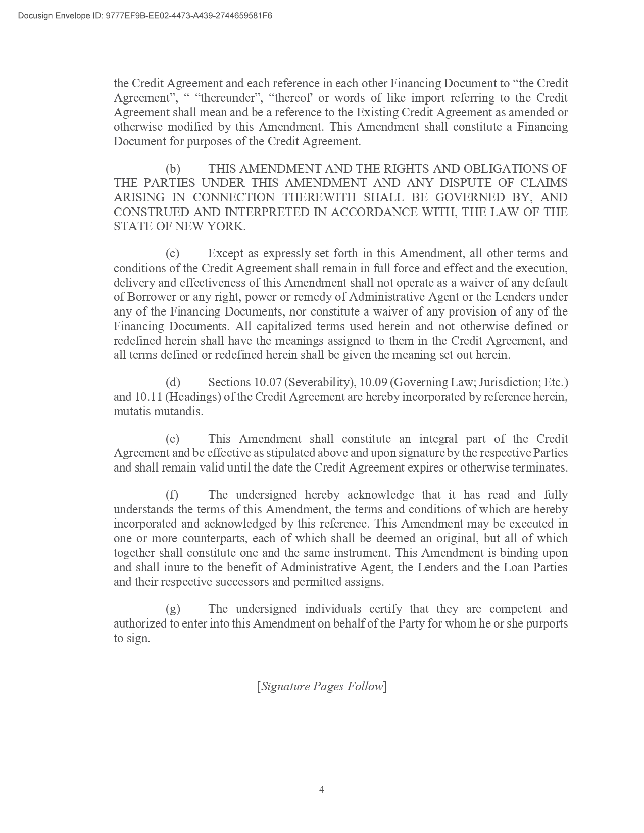 the Credit Agreement and each reference in each other Financing Document to the Credit Agreement , thereunder , thereof' or words of like import referring to the Credit Agreement shall mean and be a reference to the Existing Credit Agreement as amended or otherwise modified by this Amendment . This Amendment shall constitute a Financing Document for purposes of the Credit Agreement . (b) THIS AMENDMENT AND THE RIGHTS AND OBLIGATIONS OF THE PARTIES UNDER THIS AMENDMENT AND ANY DISPUTE OF CLAIMS ARISING IN CONNECTION THEREWITH SHALL BE GOVERNED BY, AND CONSTRUED AND INTERPRETED IN ACCORDANCE WITH, THE LAW OF THE STATE OF NEW YORK . (c) Except as expressly set forth in this Amendment, all other terms and conditions of the Credit Agreement shall remain in full force and effect and the execution, delivery and effectiveness of this Amendment shall not operate as a waiver of any default of Borrower or any right, power or remedy of Administrative Agent or the Lenders under any of the Financing Documents, nor constitute a waiver of any provision of any of the Financing Documents . All capitalized terms used herein and not otherwise defined or redefined herein shall have the meanings assigned to them in the Credit Agreement, and all terms defined or redefined herein shall be given the meaning set out herein . (d) Sections 10 . 07 (Severability), 10 . 09 (Governing Law ; Jurisdiction ; Etc . ) and 10 . 11 (Headings) of the Credit Agreement are hereby incorporated by reference herein, mutatis mutandis . (e) This Amendment shall constitute an integral part of the Credit Agreement and be effective as stipulated above and upon signature by the respective Parties and shall remain valid until the date the Credit Agreement expires or otherwise terminates . (f) The undersigned hereby acknowledge that it has read and fully understands the terms of this Amendment, the terms and conditions of which are hereby incorporated and acknowledged by this reference . This Amendment may be executed in one or more counterparts, each of which shall be deemed an original, but all of which together shall constitute one and the same instrument . This Amendment is binding upon and shall inure to the benefit of Administrative Agent, the Lenders and the Loan Parties and their respective successors and permitted assigns . (g) The undersigned individuals certify that they are competent and authorized to enter into this Amendment on behalf of the Party for whom he or she purports to sign . [ Signature Pages Follow ] 4
