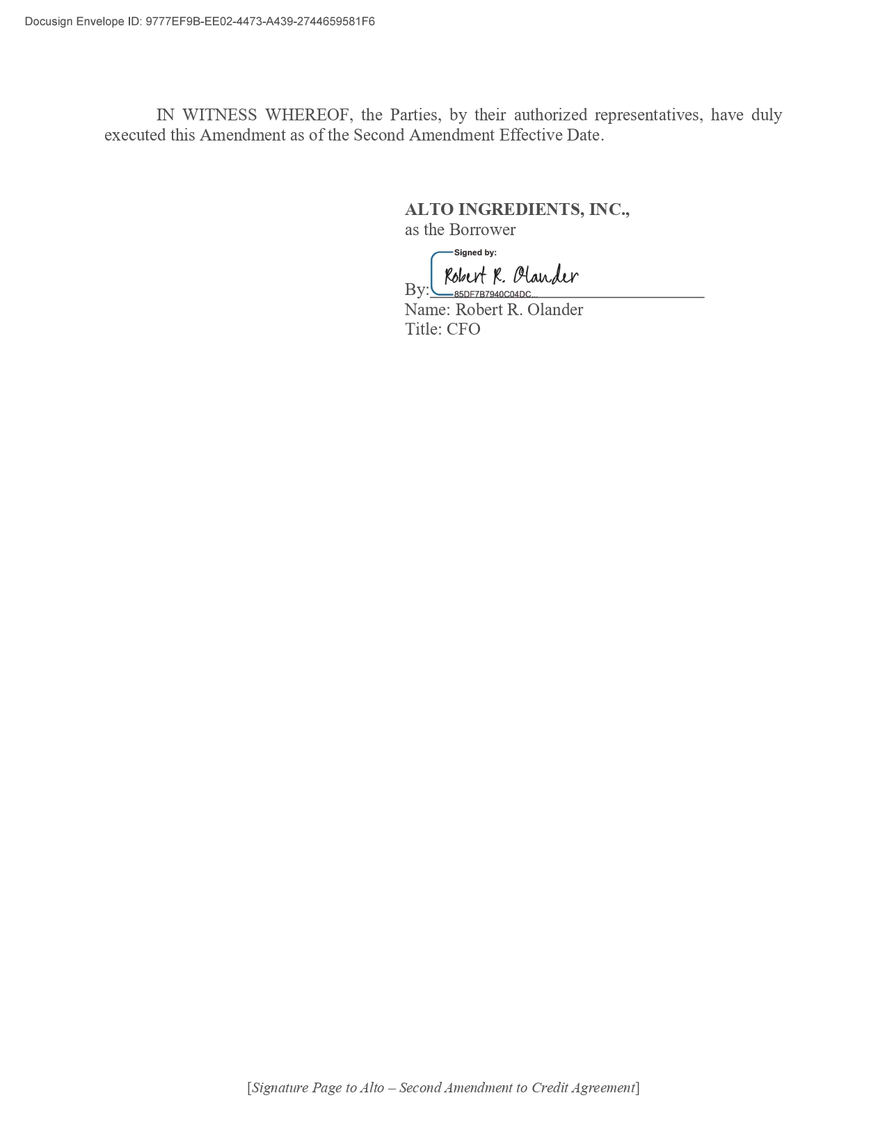 IN WITNESS WHEREOF, the Parties, by their authorized representatives, have duly executed this Amendment as of the Second Amendment Effective Date. ALTO INGREDIENTS, INC., as the Borrower By: Name: Robert R. Olander Title: CFO [ Signature Page to Alto Second Amendment to Credit Agreement ]