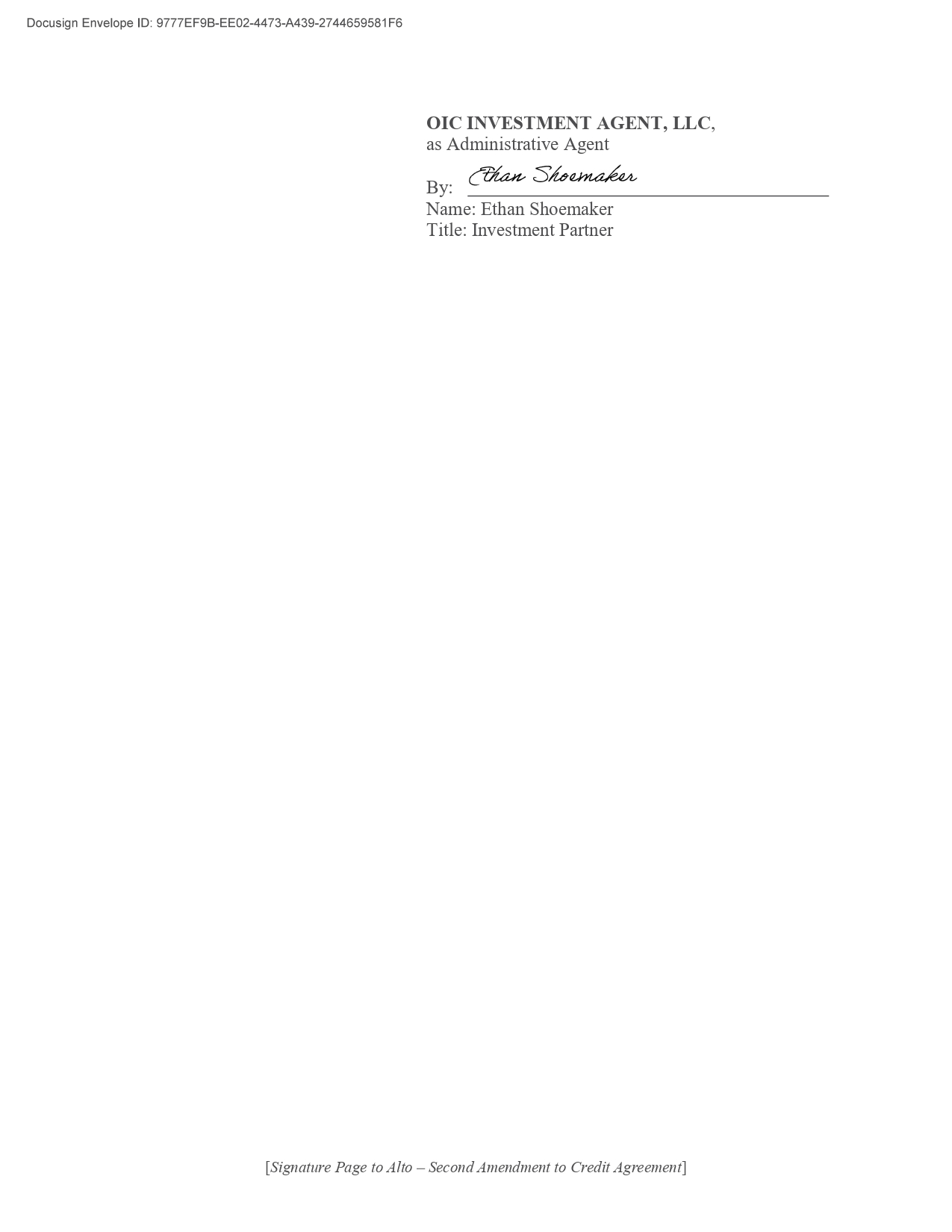 OIC INVESTMENT AGENT, LLC , as Administrative Agent By: Name: Ethan Shoemaker Title: Investment Partner [ Signature Page to Alto Second Amendment to Credit Agreement ]