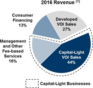 Historically, our business consisted of the sale of VOIs in resorts that we developed or acquired (“developed VOI sales”). While we continue to conduct such sales and development activities, we now also derive a significant portion of our revenue from our capital-light business model, which utilizes our expertise and infrastructure to generate both VOI sales and recurring revenue from third parties without the significant capital investment generally associated with the development and acquisition of resorts. Our capital-light business activities include sales of VOIs owned by third-party developers pursuant to which we are paid a commission (“fee-based sales”) and sales of VOIs that we purchase under just-in-time (“JIT”) arrangements with third-party developers or from secondary market sources. In addition, we provide other fee-based services, including resort management, mortgage servicing, title services and construction management. We also offer financing to qualified VOI purchasers, which generates significant interest income.