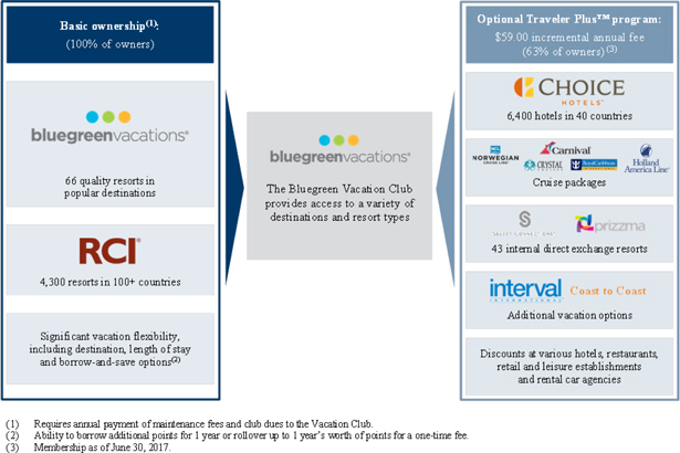 We are a leading vacation ownership company that markets and sells vacation ownership interests (“VOIs”) and manages resorts in top leisure and urban destinations. Our resort network includes 42 Club Resorts (resorts in which owners in the Bluegreen Vacation Club (“Vacation Club”) have the right to use most of the units in connection with their VOI ownership) and 24 Club Associate Resorts (resorts in which owners in our Vacation Club have the right to use a limited number of units in connection with their VOI ownership). Our Club Resorts and Club Associate Resorts are primarily located in popular, high-volume, “drive-to” vacation locations, including Orlando, Las Vegas, Myrtle Beach and Charleston, among others. Through our points-based system, the approximately 210,000 owners in our Vacation Club have the flexibility to stay at units available at any of our resorts and have access to almost 11,000 other hotels and resorts through partnerships and exchange networks. We have a robust sales and marketing platform supported by exclusive marketing relationships with nationally-recognized consumer brands, such as Bass Pro and Choice Hotels, which drive sales within our core demographic.