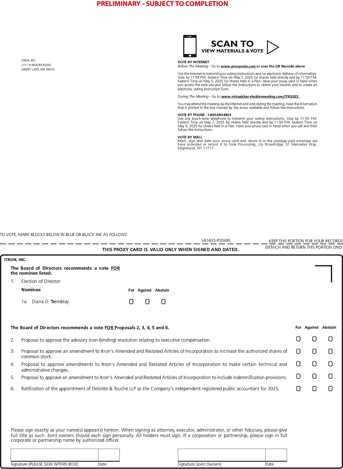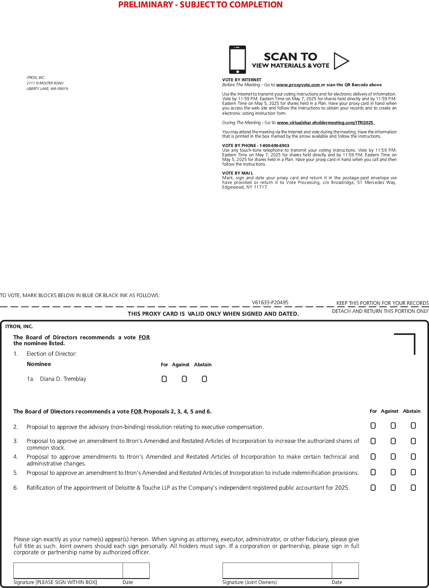 This proxy statement is being furnished to shareholders of Itron, Inc. (the Company or Itron) in connection with the solicitation by our Board of Directors of proxies for use at the 2025 annual meeting of shareholders. The meeting is scheduled to be held on May 8, 2025, at 9:00 a.m., Pacific Time, via live webcast through the link, for the purposes listed in the accompanying Notice of Annual Meeting of Shareholders. You will need the 16-digit control number provided on the Notice of Internet Availability of Proxy Materials or your proxy card (if applicable). We have made these materials available to you over the Internet or have delivered printed versions of these materials to you by mail, in connection with the Board’s solicitation of proxies for use at the annual meeting. This solicitation is for proxies for use at the annual meeting or at any reconvened meeting after an adjournment or postponement of the annual meeting. The Company’s principal executive office is at 2111 North Molter Road, Liberty Lake, Washington, 99019.