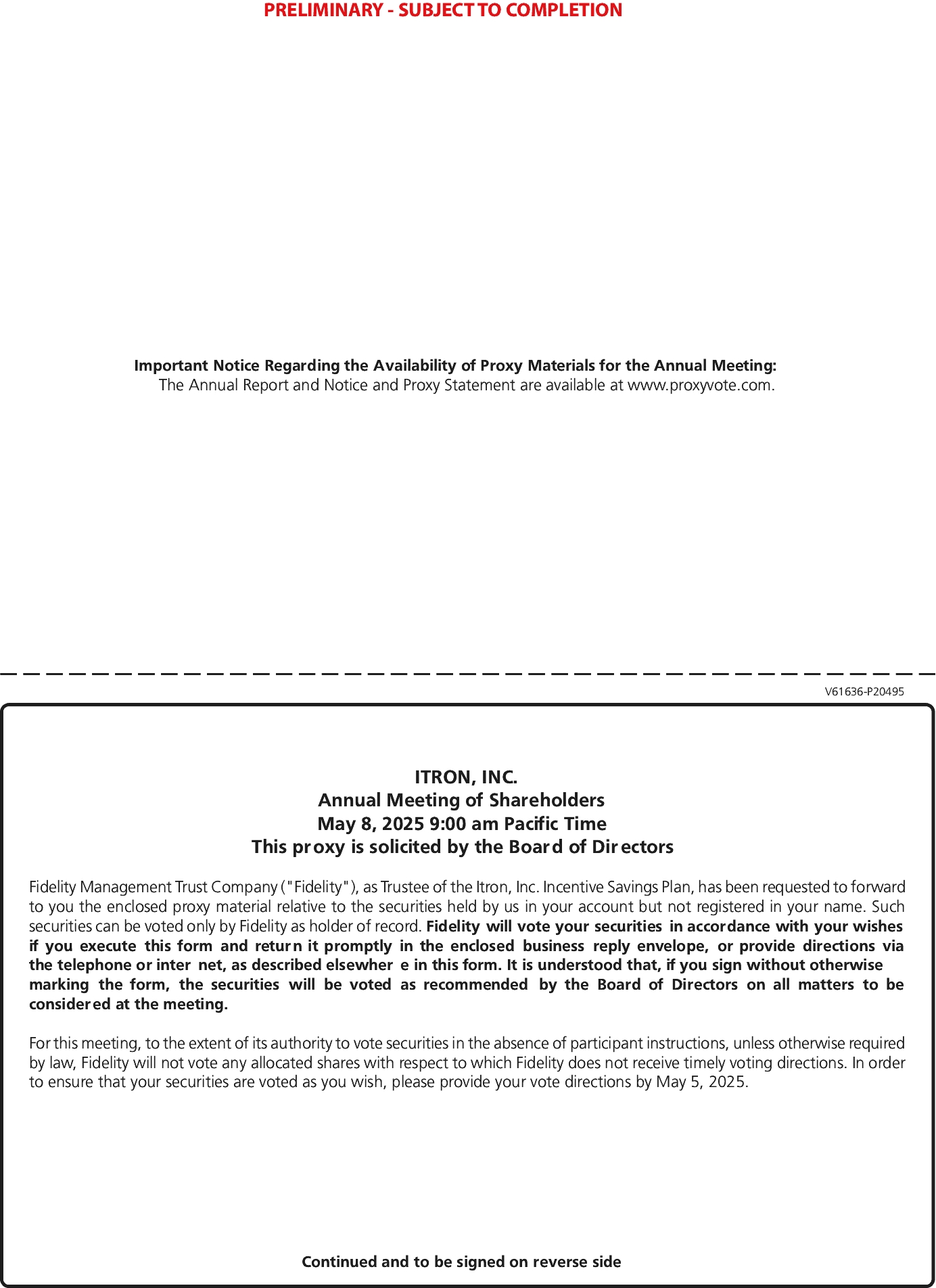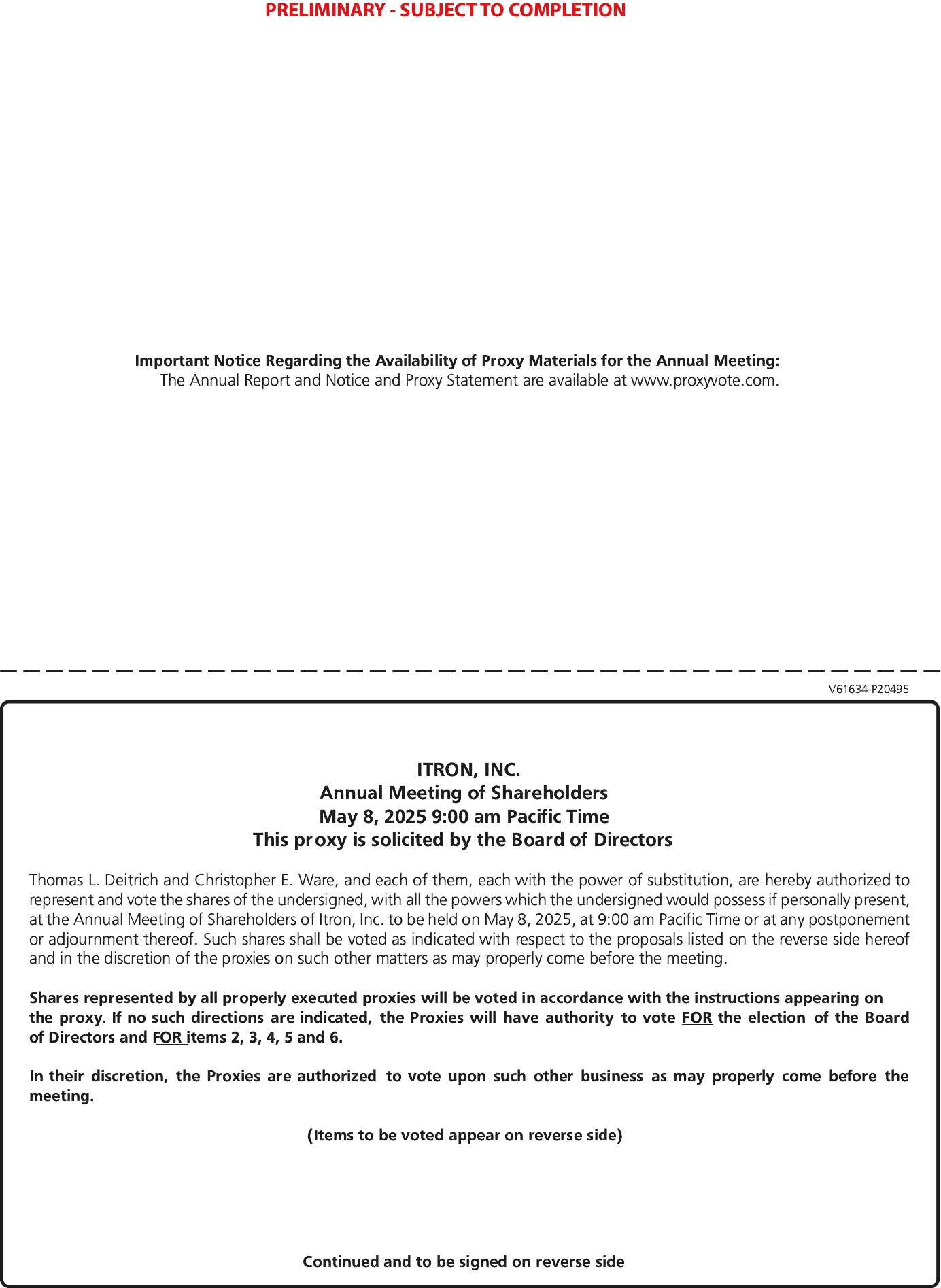 We are holding our annual meeting via a “virtual” format. Therefore, we cordially invite you to electronically attend the Annual Meeting of Shareholders of Itron, Inc., which will be held on May 8, 2025, at 9:00 a.m., Pacific Time. We are pleased to announce that this year’s annual meeting will be a virtual meeting via live webcast on the Internet. You will be able to attend the annual meeting, vote and submit your questions during the meeting by visiting: www.virtualshareholdermeeting.com/ITRI2025