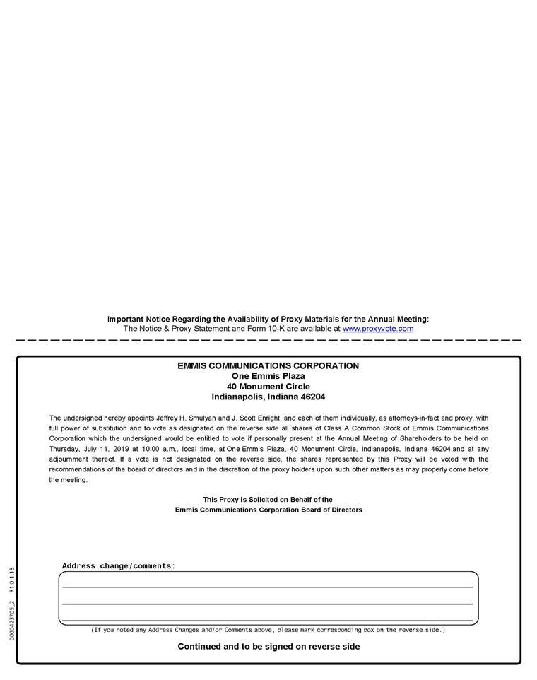 Important Notice Regarding the Availability of Proxy Materials for the Annual Meeting: The Notice & Proxy Statement and Form 10-K are available at www.proxyvote.com EMMIS COMMUNICATIONS CORPORATION One Emmis Plaza 40 Monument Circle Indianapolis, Indiana 46204 The undersigned hereby appoints Jeffrey H. Smulyan and J. Scott Enright, and each of them individually, as attorneys-in-fact and proxy, with full power of substitution and to vote as designated on the reverse side all shares of Class A Common Stock of Emmis Communications Corporation which the undersigned would be entitled to vote if personally present at the Annual Meeting of Shareholders to be held on Thursday, July 11, 2019 at 10:00 a.m., local time, at One Emmis Plaza, 40 Monument Circle, Indianapolis, Indiana 46204 and at any adjournment thereof. If a vote is not designated on the reverse side, the shares represented by this Proxy will be voted with the recommendations of the board of directors and in the discretion of the proxy holders upon such other matters as may properly come before the meeting. This Proxy is Solicited on Behalf of the Emmis Communications Corporation Board of Directors Address change/comments: (If you noted any Address Changes and/or Comments above, please mark corresponding box on the reverse side.) Continued and to be signed on reverse side 0000423705_2 R1.0.1.18