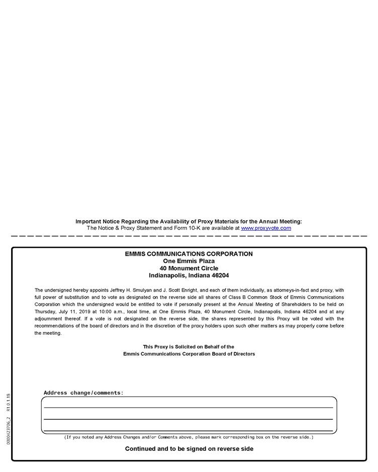 Important Notice Regarding the Availability of Proxy Materials for the Annual Meeting: The Notice & Proxy Statement and Form 10-K are available at www.proxyvote.com EMMIS COMMUNICATIONS CORPORATION One Emmis Plaza 40 Monument Circle Indianapolis, Indiana 46204 The undersigned hereby appoints Jeffrey H. Smulyan and J. Scott Enright, and each of them individually, as attorneys-in-fact and proxy, with full power of substitution and to vote as designated on the reverse side all shares of Class B Common Stock of Emmis Communications Corporation which the undersigned would be entitled to vote if personally present at the Annual Meeting of Shareholders to be held on Thursday, July 11, 2019 at 10:00 a.m., local time, at One Emmis Plaza, 40 Monument Circle, Indianapolis, Indiana 46204 and at any adjournment thereof. If a vote is not designated on the reverse side, the shares represented by this Proxy will be voted with the recommendations of the board of directors and in the discretion of the proxy holders upon such other matters as may properly come before the meeting. This Proxy is Solicited on Behalf of the Emmis Communications Corporation Board of Directors Address change/comments: (If you noted any Address Changes and/or Comments above, please mark corresponding box on the reverse side.) Continued and to be signed on reverse side 0000423706_2 R1.0.1.18