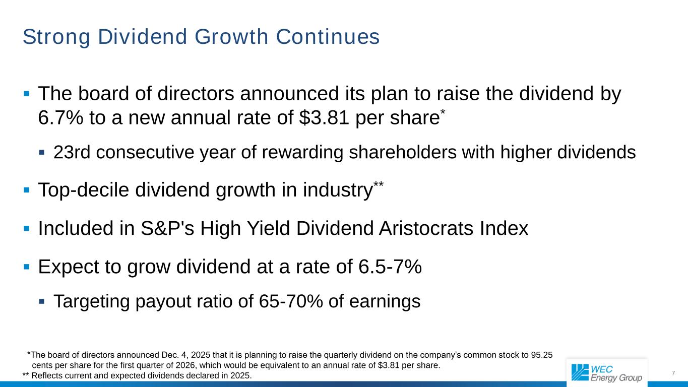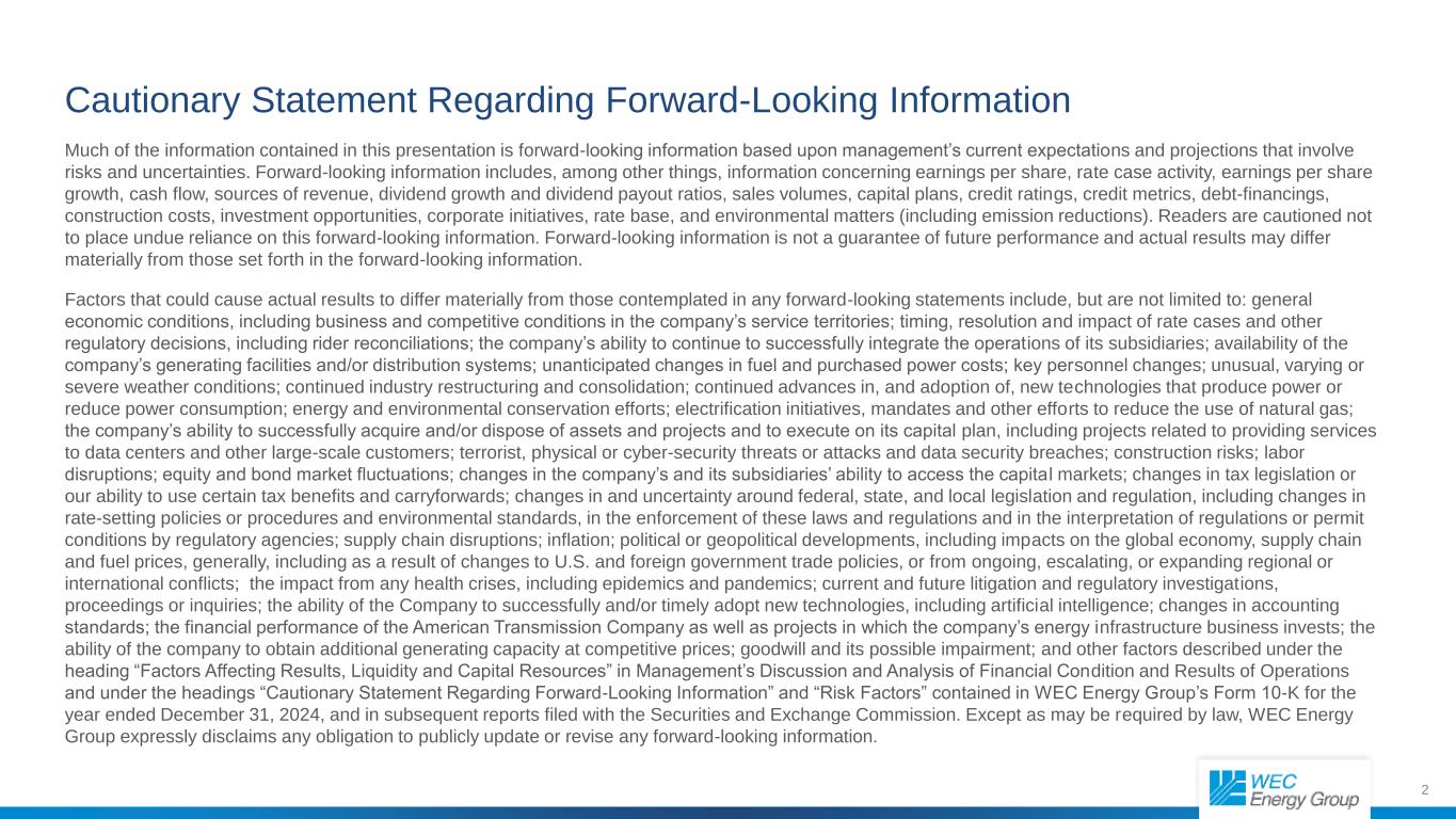 2 Cautionary Statement Regarding Forward-Looking Information Much of the information contained in this presentation is forward-looking information based upon management’s current expectations and projections that involve risks and uncertainties. Forward-looking information includes, among other things, information concerning earnings per share, rate case activity, earnings per share growth, cash flow, sources of revenue, dividend growth and dividend payout ratios, sales volumes, capital plans, credit ratings, credit metrics, debt-financings, construction costs, investment opportunities, corporate initiatives, rate base, and environmental matters (including emission reductions). Readers are cautioned not to place undue reliance on this forward-looking information. Forward-looking information is not a guarantee of future performance and actual results may differ materially from those set forth in the forward-looking information. Factors that could cause actual results to differ materially from those contemplated in any forward-looking statements include, but are not limited to: general economic conditions, including business and competitive conditions in the company’s service territories; timing, resolution and impact of rate cases and other regulatory decisions, including rider reconciliations; the company’s ability to continue to successfully integrate the operations of its subsidiaries; availability of the company’s generating facilities and/or distribution systems; unanticipated changes in fuel and purchased power costs; key personnel changes; unusual, varying or severe weather conditions; continued industry restructuring and consolidation; continued advances in, and adoption of, new technologies that produce power or reduce power consumption; energy and environmental conservation efforts; electrification initiatives, mandates and other efforts to reduce the use of natural gas; the company’s ability to successfully acquire and/or dispose of assets and projects and to execute on its capital plan, including projects related to providing services to data centers and other large-scale customers; terrorist, physical or cyber-security threats or attacks and data security breaches; construction risks; labor disruptions; equity and bond market fluctuations; changes in the company’s and its subsidiaries’ ability to access the capital markets; changes in tax legislation or our ability to use certain tax benefits and carryforwards; changes in and uncertainty around federal, state, and local legislation and regulation, including changes in rate-setting policies or procedures and environmental standards, in the enforcement of these laws and regulations and in the interpretation of regulations or permit conditions by regulatory agencies; supply chain disruptions; inflation; political or geopolitical developments, including impacts on the global economy, supply chain and fuel prices, generally, including as a result of changes to U.S. and foreign government trade policies, or from ongoing, escalating, or expanding regional or international conflicts; the impact from any health crises, including epidemics and pandemics; current and future litigation and regulatory investigations, proceedings or inquiries; the ability of the Company to successfully and/or timely adopt new technologies, including artificial intelligence; changes in accounting standards; the financial performance of the American Transmission Company as well as projects in which the company’s energy infrastructure business invests; the ability of the company to obtain additional generating capacity at competitive prices; goodwill and its possible impairment; and other factors described under the heading “Factors Affecting Results, Liquidity and Capital Resources” in Management’s Discussion and Analysis of Financial Condition and Results of Operations and under the headings “Cautionary Statement Regarding Forward-Looking Information” and “Risk Factors” contained in WEC Energy Group’s Form 10-K for the year ended December 31, 2024, and in subsequent reports filed with the Securities and Exchange Commission. Except as may be required by law, WEC Energy Group expressly disclaims any obligation to publicly update or revise any forward-looking information.