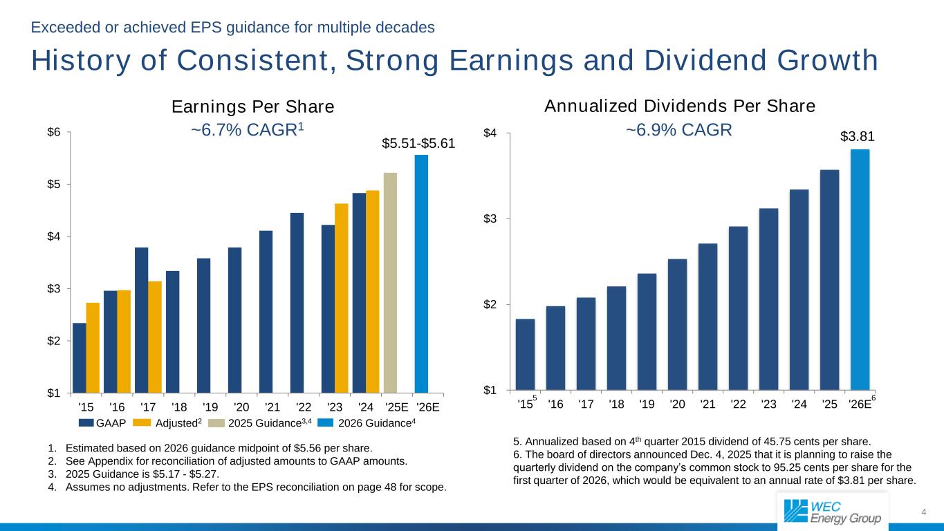 3 A Premier Energy Company in America’s Heartland * As of Nov. 28, 2025 $36.5 billion market cap* 4.7 million retail customers $49.8 billion of assets 60% ownership of American Transmission Company Ranked first overall in the 2025 E Source Large Business Customer Satisfaction Study