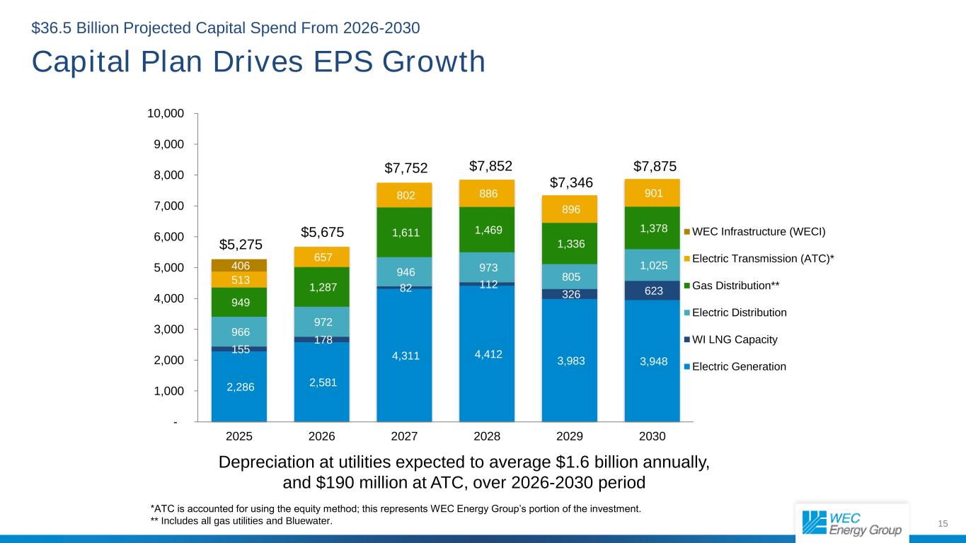 14 $13.2 $19.3 $1.4 $1.3 $4.5 $4.7 $5.3 $7.1 $3.2 $4.1 $0.4 $28.0 $36.5 2025-2029 2026-2030 WEC Infrastructure (WECI) Electric Transmission (ATC)* Gas Distribution** Electric Distribution WI LNG Capacity Electric Generation N e w p la n F o rm e r p la n *ATC is accounted for using the equity method; this represents WEC Energy Group’s portion of the investment. ** Includes all gas utilities and Bluewater. $ In billions Increasing Five-Year Capital Plan by $8.5 Billion 2026-2030 Capital Plan Supports 7.0% to 8.0% Long-Term EPS Growth