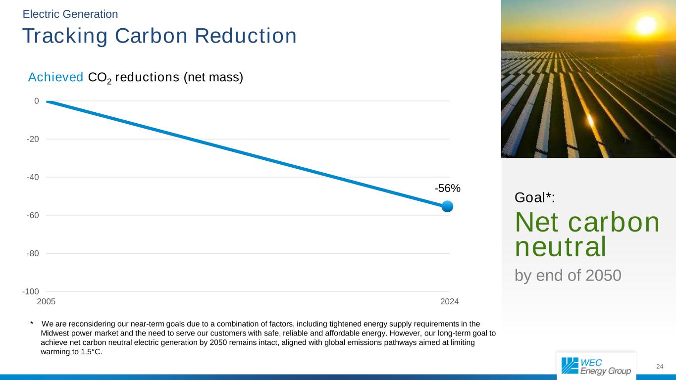 23 Coal Generation Since 2018, we have retired nearly 2,500 MW of fossil fuel generation Retirements planned: Oak Creek Units 7-8: 611 MW (targeting end of 2026) Weston Unit 3: 328 MW (expected end of 2031) Enhancing fuel flexibility (gas blending) at Oak Creek Power the Future units and Weston Unit 4* Evaluating the future of Columbia Units 1 and 2 Exploring conversion of both units to natural gas By end of 2030, we expect to use coal only as a backup fuel. We plan to eliminate coal as an energy source by end of 2032 *Filed for acquisition of an additional 165 MW of Weston 4 for an estimated investment of $150 million. Pending regulatory approval.