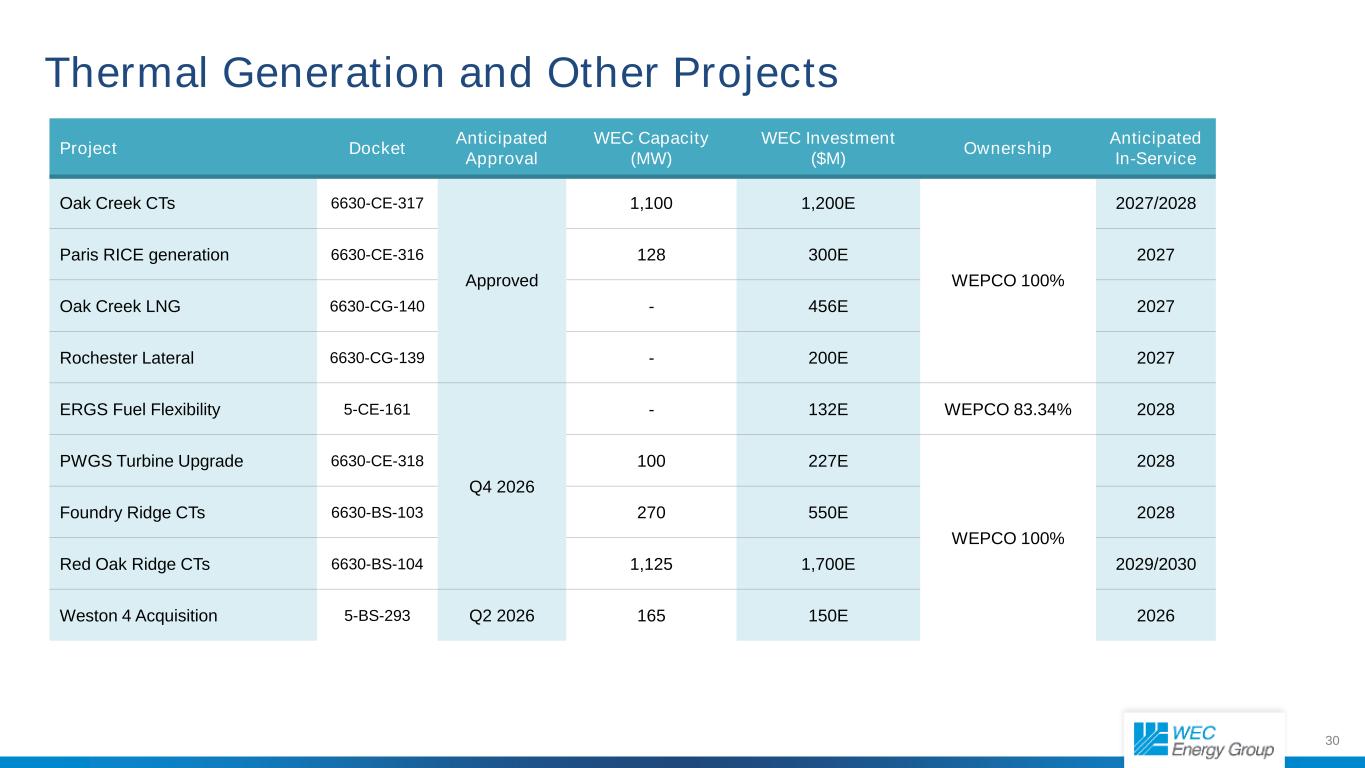29 Battery Projects Docket Anticipated Approval WEC Capacity (MW) WEC Investment ($M) Ownership Anticipated In-Service Darien Battery Park 5-BS-255 Approved 68 140E WEPCO/WPS 90%1 2026 Koshkonong Battery Park 5-BS-258 149 309E 2027 High Noon Battery Park 5-BS-276 149 307E 2027 Saratoga Battery Park 5-BS-280 45 92E 2028 Dawn Harvest Battery Park 5-BS-581 Q1 2026 50 106E WEPCO 100% 2028 Dawn Break Battery Park 5-BS-289 Q4 2026 162 320E WEPCO 90%1 2029 Regulated Renewable Generation and Storage Projects 1. Madison Gas and Electric owns/will own a minority interest at each site. Wind Projects Docket Anticipated Approval WEC Capacity (MW) WEC Investment ($M) Ownership Anticipated In-Service Badger Hollow Wind 5-BS-282 Approved 100 320E WEPCO/WPS 90%1 2027 Whitetail Wind 60 200E 2027