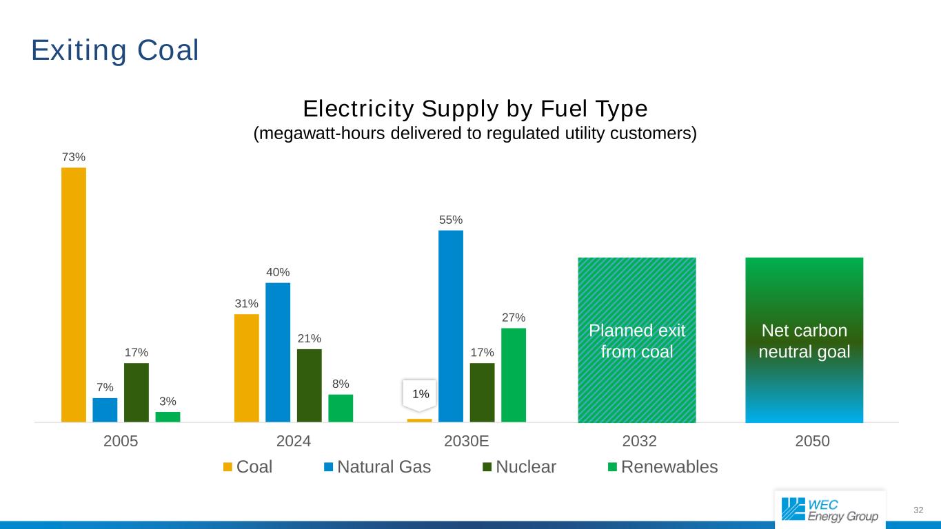 32 73% 31% 7% 40% 55% 17% 21% 17% 3% 8% 27% 2005 2024 2030E 2032 2050 Coal Natural Gas Nuclear Renewables 1% Net carbon neutral goal Planned exit from coal Exiting Coal Electricity Supply by Fuel Type (megawatt-hours delivered to regulated utility customers)