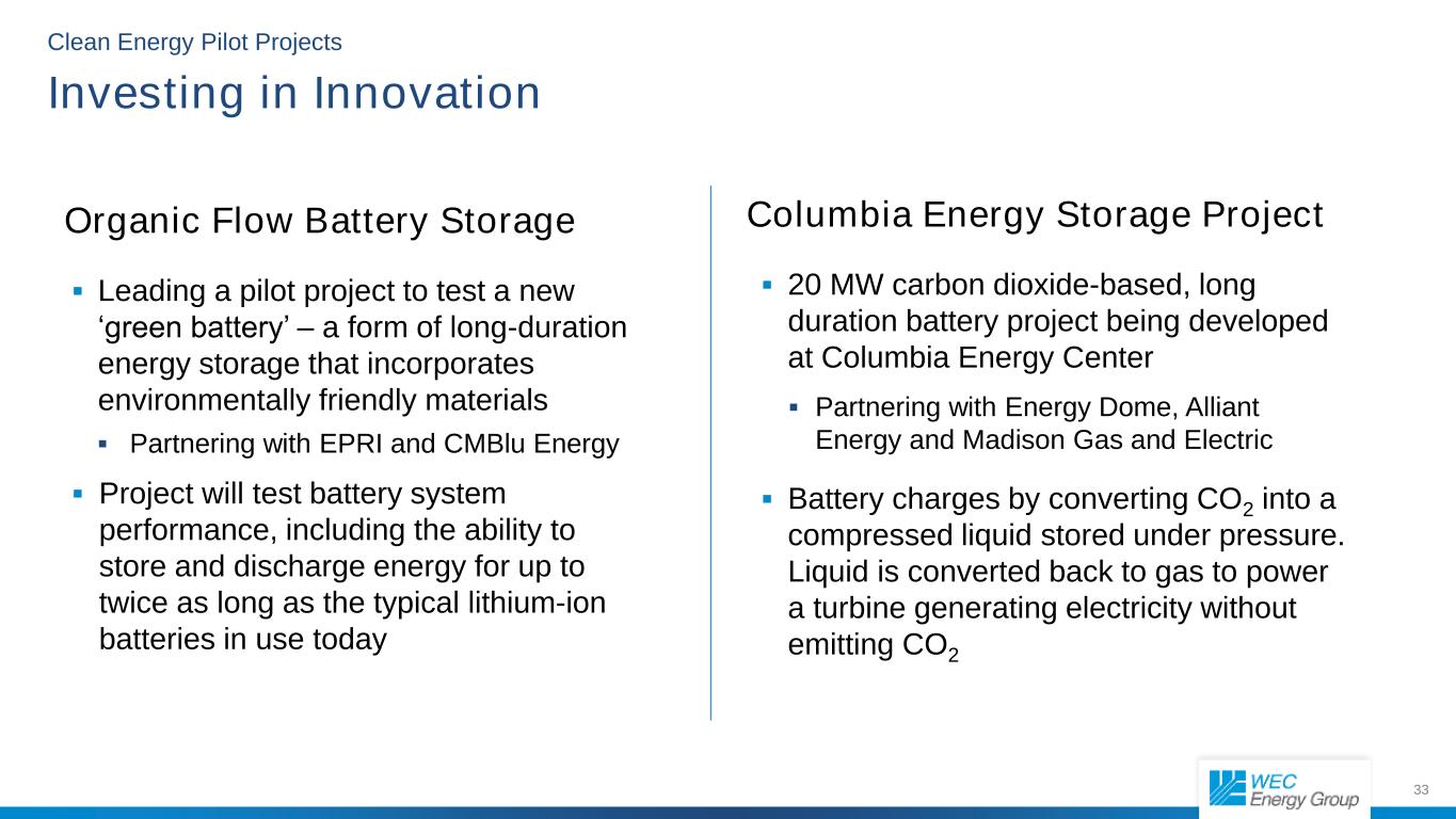 33 Clean Energy Pilot Projects Investing in Innovation Organic Flow Battery Storage Leading a pilot project to test a new ‘green battery’ – a form of long-duration energy storage that incorporates environmentally friendly materials Partnering with EPRI and CMBlu Energy Project will test battery system performance, including the ability to store and discharge energy for up to twice as long as the typical lithium-ion batteries in use today Columbia Energy Storage Project 20 MW carbon dioxide-based, long duration battery project being developed at Columbia Energy Center Partnering with Energy Dome, Alliant Energy and Madison Gas and Electric Battery charges by converting CO2 into a compressed liquid stored under pressure. Liquid is converted back to gas to power a turbine generating electricity without emitting CO2